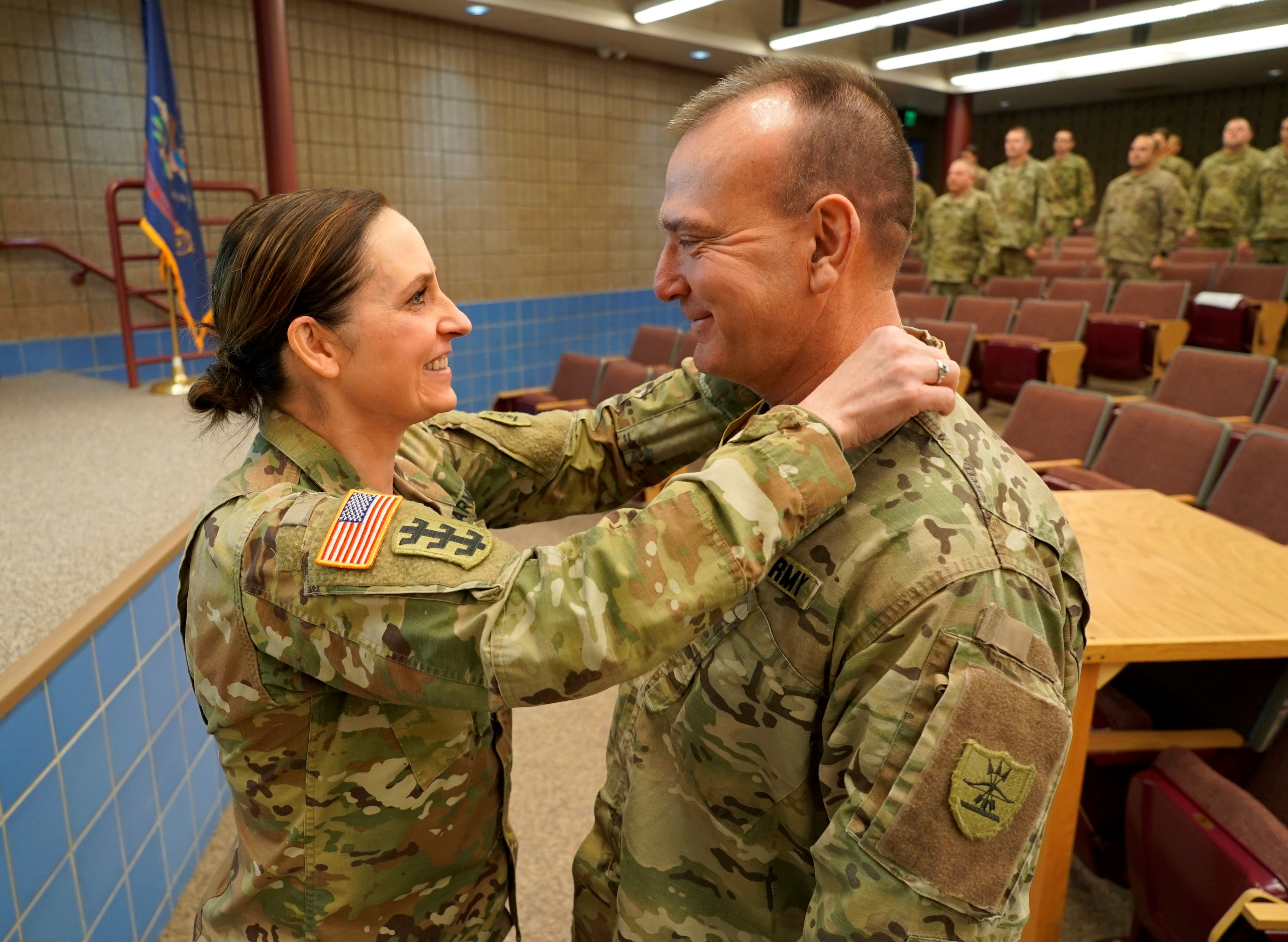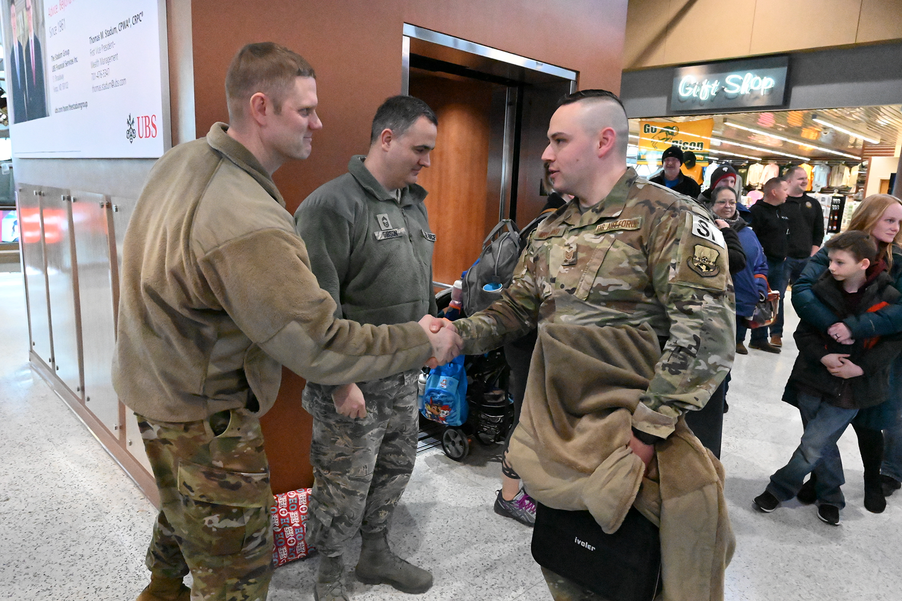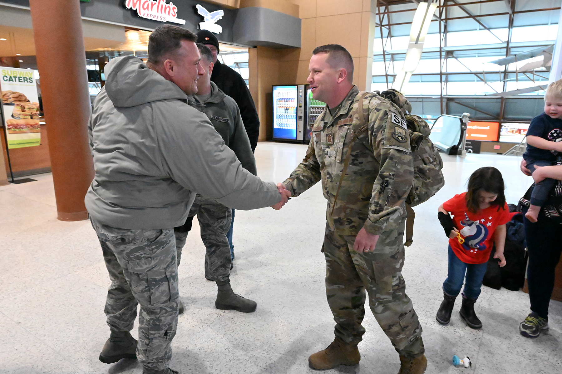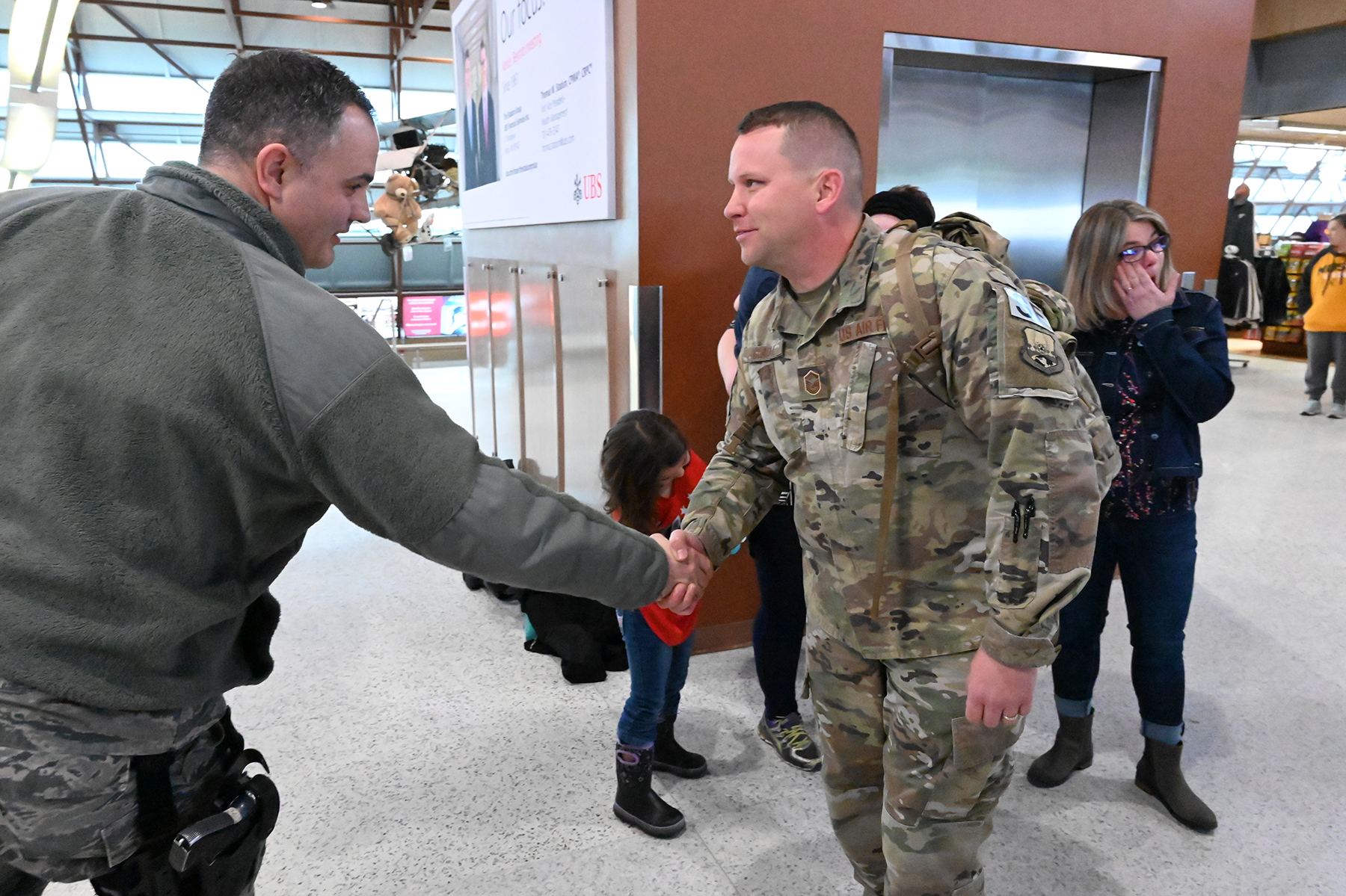 Chief Master Sgt. Steven Gibson, the 119th Security Forces Squadron manager, left, greets Master Sgt. Richard Gladue as he arrives at Hector International Airport in Fargo after completion of a six-month deployment to southwest Asia Jan. 24.