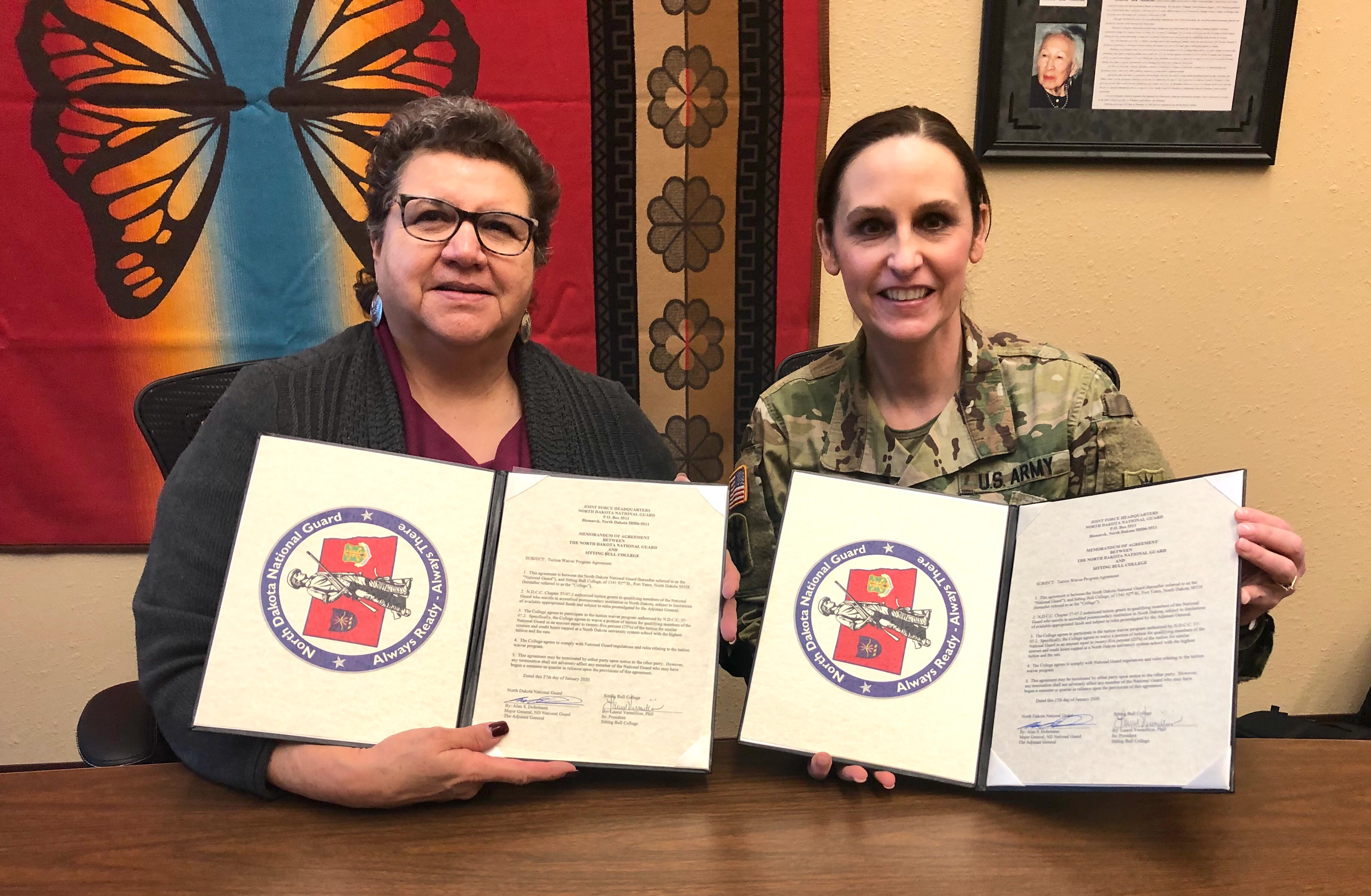 Sitting Bull College (SBC) agreed to participate in the state’s tuition waiver program, in which the college can waive an amount equal to 25% of tuition for qualifying members of the N.D. Guard. Signing the Memorandum of Agreement were Dr. Laurel Vermillion, President SBC, and Brig. Gen. Jackie Huber, deputy adjutant general.