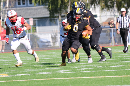 Raysen Motoyama found paydirt from five yards out for the Lutes' second score of the opening quarter. A seven yard catch from Manuel Felan capped off a 96-yard drive early in the second quarter before Chaffin scrambled 21-yards for a TD later in the frame as the Lutes enjoyed a 28-7 lead at the halftime intermission.