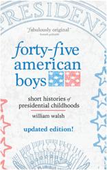 "In Forty-five American Boys, William Walsh limns a complete series of cabinet portraits that show how tales, memories, and artifacts create the story of a life. But, of course, these are not just any lives. These are about forty-five of the most ambitious men in American history. By witnessing their childhood, Walsh shows when the commonality of boyhood mixes with the seeds of idealism and determination—the early sparks for the eventual combustion that will create something larger than life. Forty-five American Boys is a meticulously crafted collage of myth, legend, and fact that tells us as much about these boys as it tells us about ourselves as individuals and as a culture." — Adam Braver, author of Mr Lincoln’s Wars and November 22, 1963