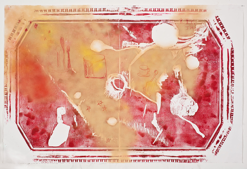 Jessica Jackson Hutchins is known mainly for her work as a sculptor, where she transforms everyday objects like worn clothing and tattered furniture into artistic statements, merging the corporeal with the abstract. Similar to her sculptures, her prints feature her family’s kitchen table, along with her favorite pieces of clothing and books, as works of art. This practice reveals the humanity behind creative expression, illustrating how personal experience fuels artistic vision. She explores themes of fragility and connection among the uncertainty of personal relationships and public personas. Similarly, monoprinting embodies a unique artistic process that results in a one-of-a-kind work of art. Unlike traditional printing methods that produce multiple identical copies, once ink is applied to a monoprint, the plate can no longer reproduce the same image, ensuring that no two monoprints are alike. Transformation, traces of effort, unexpected outcomes, and the time reflected in the humanity of objects are essential to Hutchin’s exploration of how we connect with the world and understand ourselves through the things we experience.
