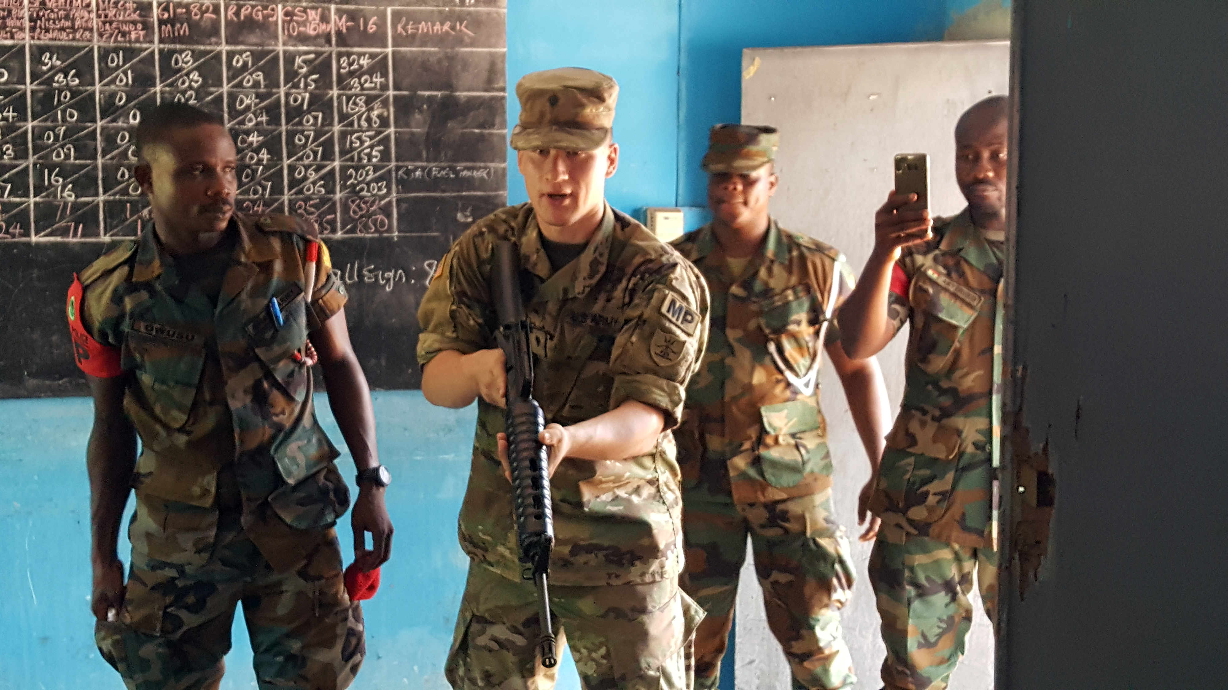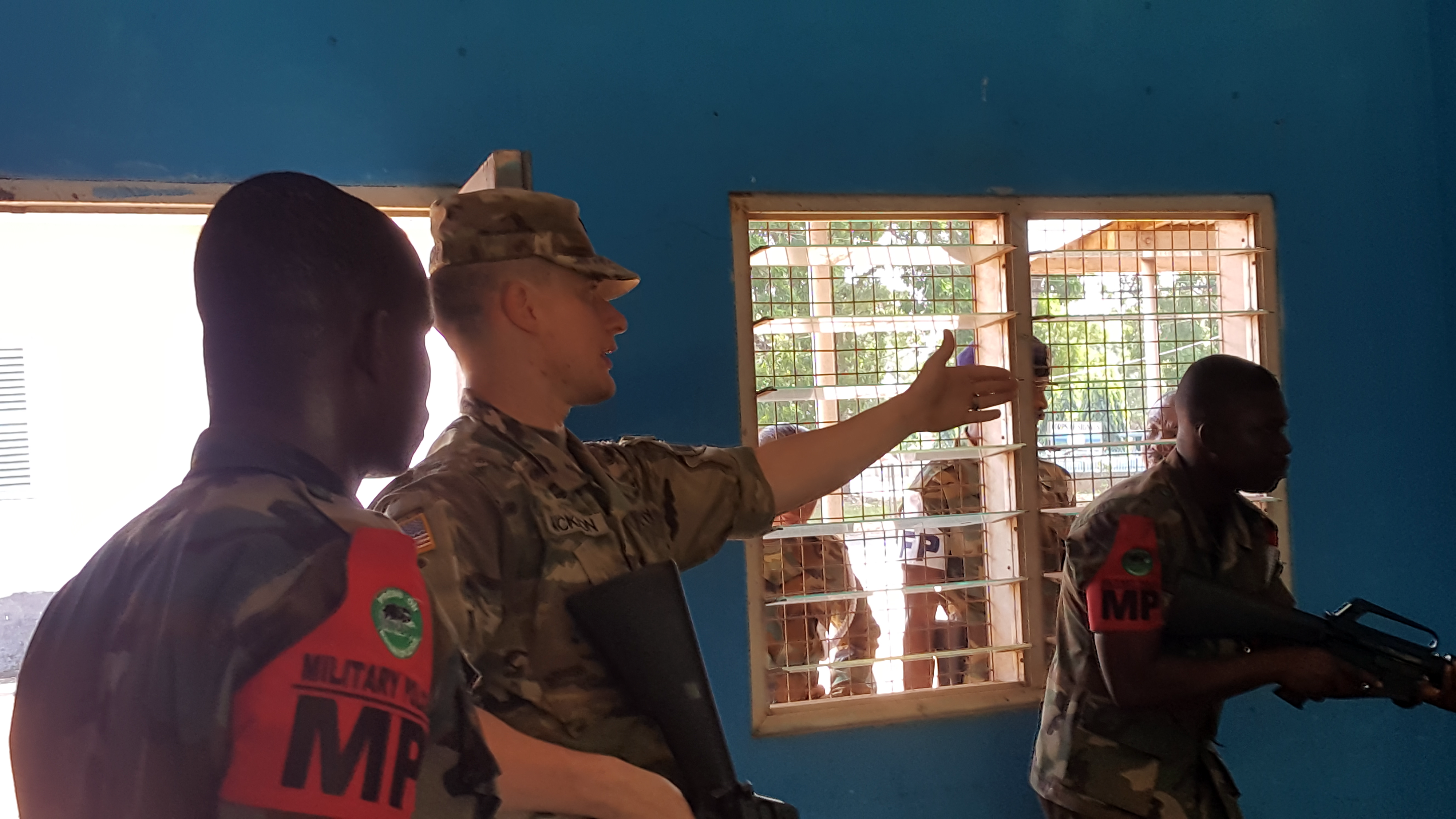 In June, 191st Military Police (MP) Company Soldiers, 1st Lt. Bradley McGinnis and Spc. Isaiah Jackson, worked with members of the Ghana Armed Forces (GAF), our original state partner through the State Partnership Program, at Burma Camp near Accra, Ghana. The exercises included military police functions useful for peacekeeping operations such as mission planning, troop leading procedures, military operations in urban terrain, entry control points and vehicle searches. The exercises culminated with a night-time scenario which incorporated all lessons learned into a single continuous event. Top photo: Spc. Jackson demonstrates how U.S. Army forces clear rooms in an urban environment to a group of Ghanaian military members.