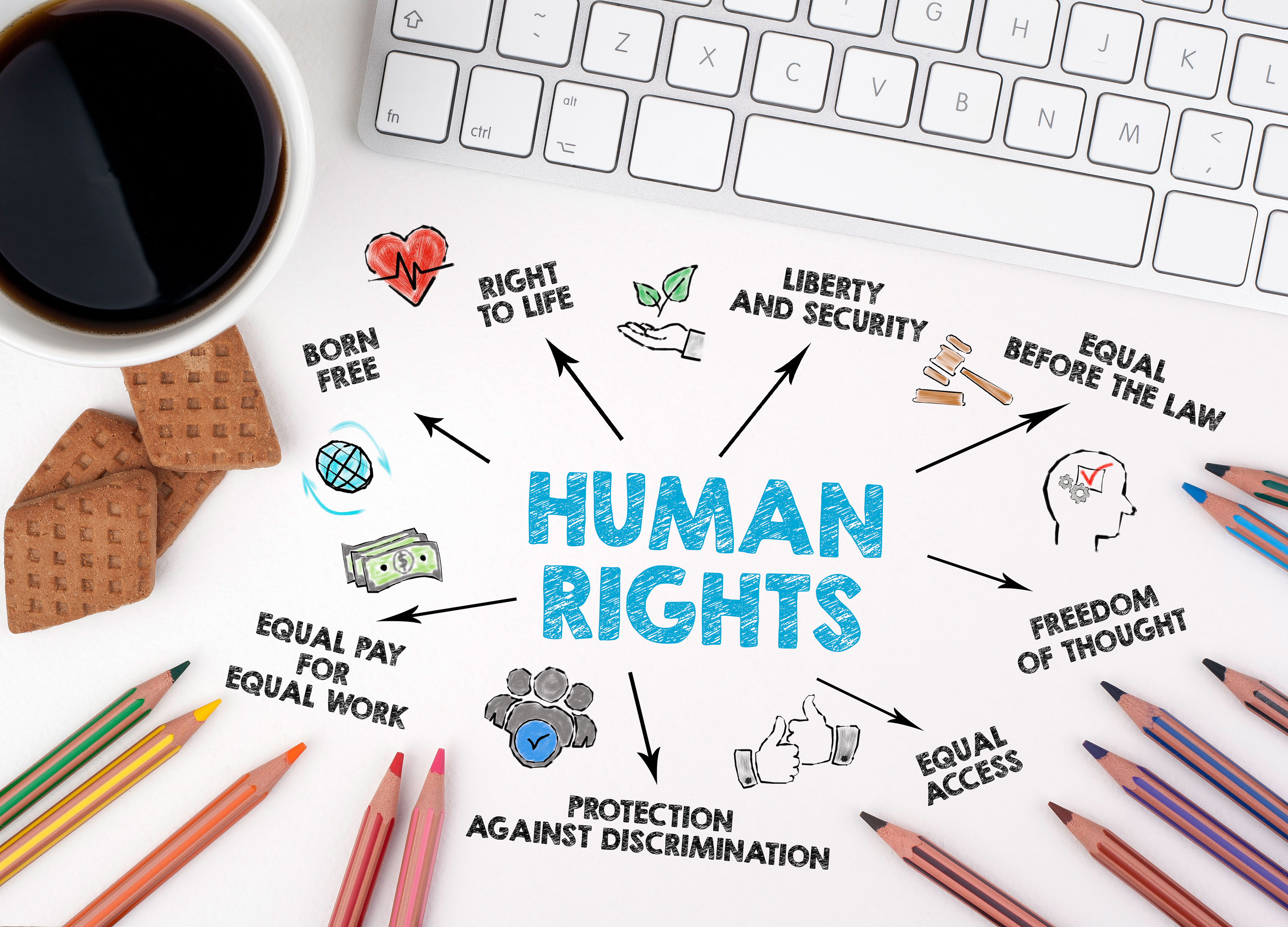 Created with images by sebra - "Gavel of justice and scales on the table" • dizain - "Advocacy bulb word cloud concept" • STOATPHOTO - "human rights abstract Concept. Chart with keywords and icons. White office desk" • Belight - "Multicultural society and international tolerance celebration of multicultural and african, asian, american and caucasian culture integration and pride as a multi cultural group."