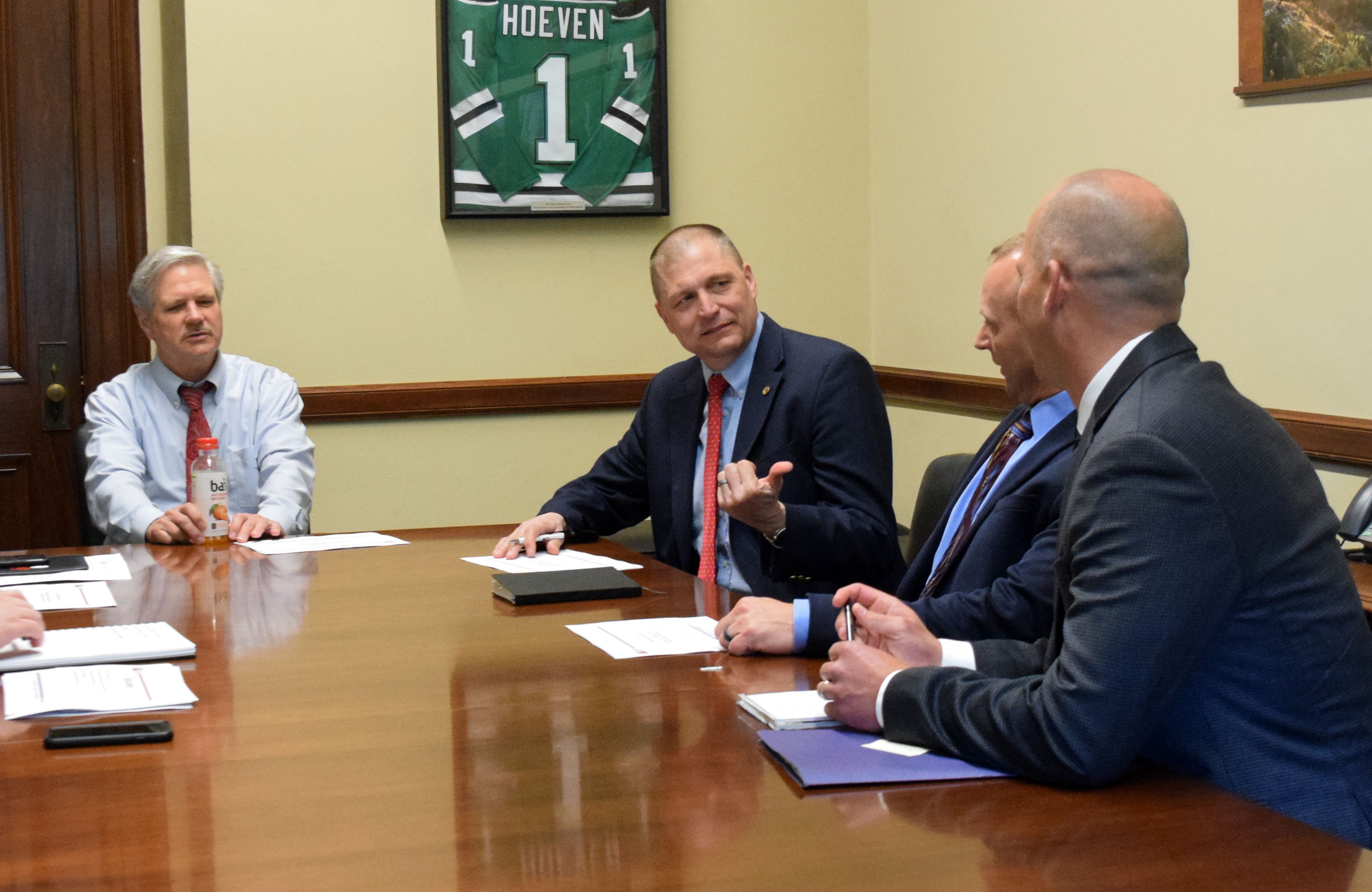 Senator John Hoeven (left) meets with Maj. Gen. Al Dohrmann (center) and other staff members in Washington, D.C. this past week. Hoeven sponsored a bill, co-sponsored by Sen. Kevin Cramer, which addresses the dual compensation issue (currently, G.I. Bill cannot be simultaneously used with Federal Tuition Assistance) while U.S. Rep. Armstrong has agreed to support the 911 Saves Act. All of our N.D. delegates have previously supported the TRICARE Reform Act.