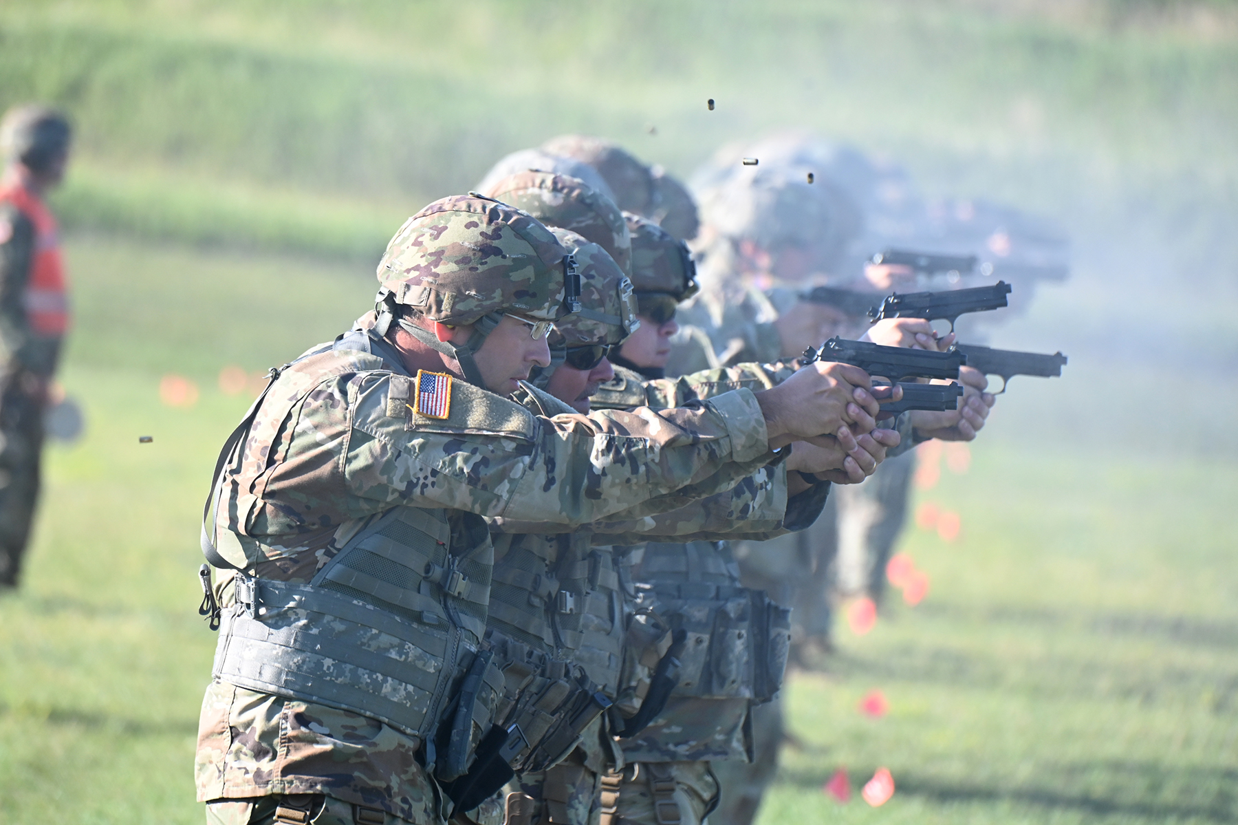 Spc. Lasean Pickstock, 957th Engineer Company, takes aim toward target with his M9 Berretta pistol during a marksmanship match at Camp Grafton Training Center on July 10.