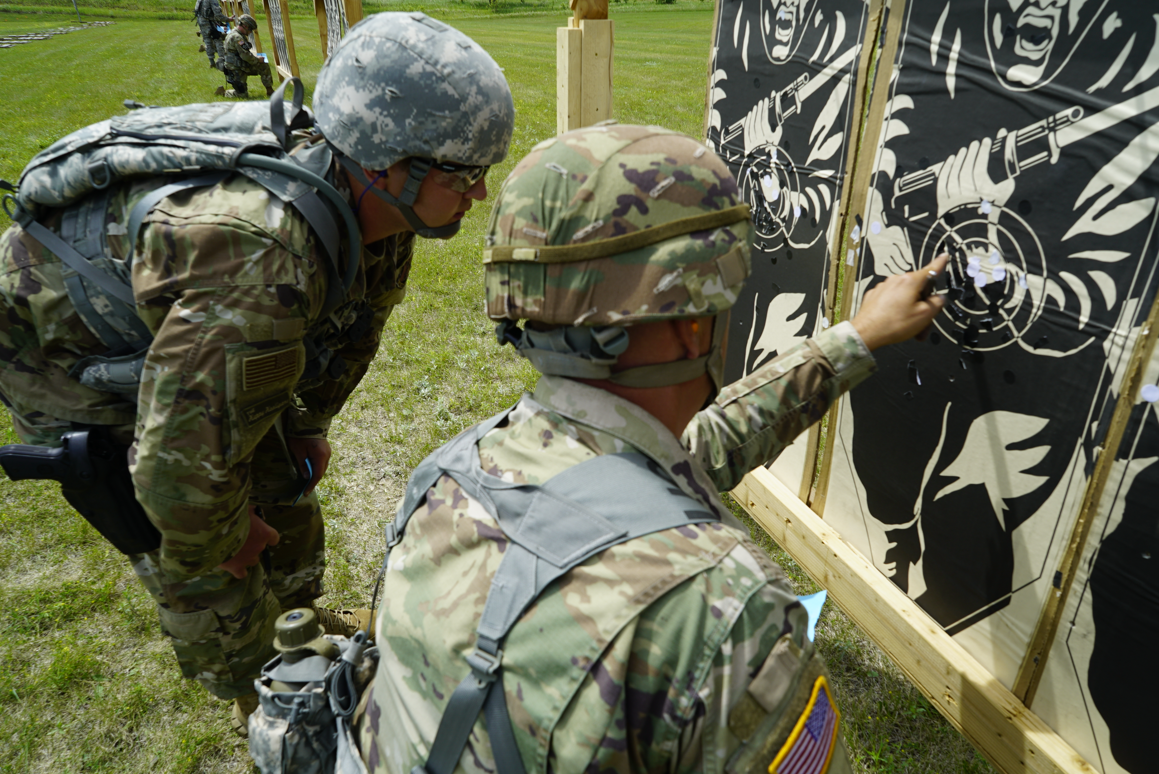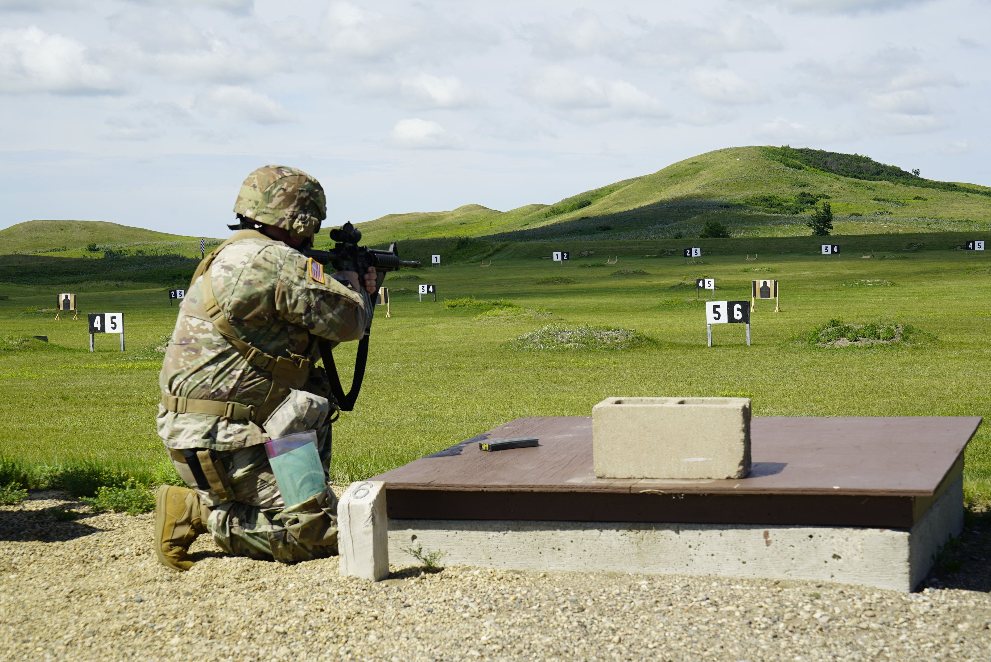 Spc. Levi Harrington, 817th Engineer Company, prepares to fire his M4 rifle during a marksmanship match at Camp Grafton Training Center on July 10.