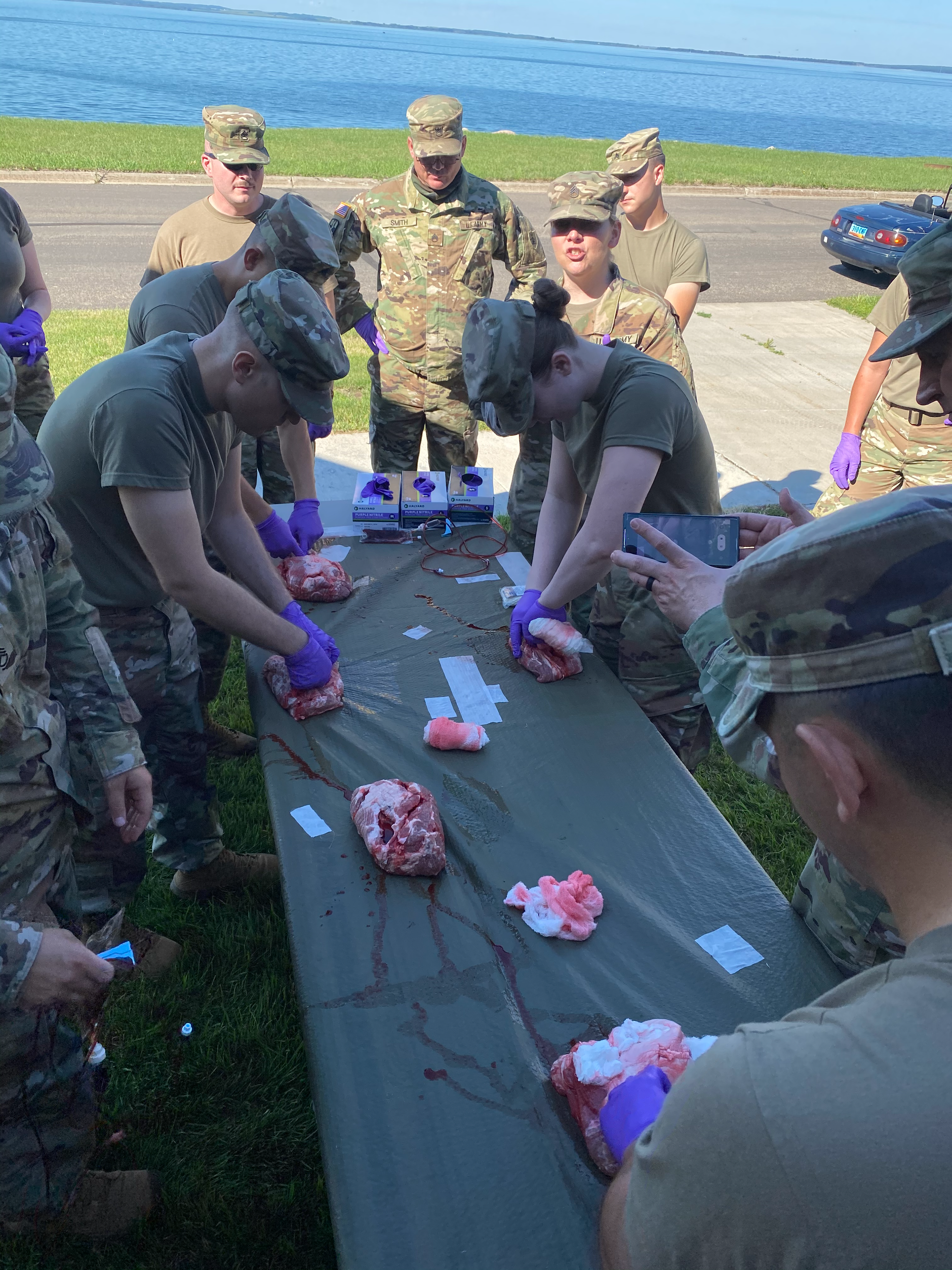 Combat Medics, Army MOS 68W, from units all across North Dakota, attended specialized medical training at the Camp Grafton Training Center from July 11 to 17. The purpose of the training was to re-certify their medical skills and earn continuation hours towards their Nationally Registered Emergency Medical Technician (NREMT) certification. Training included a Mass Casualty exercise which tested the medics' abilities to conduct triage, and treat multiple patients with limited medical personnel and equipment.