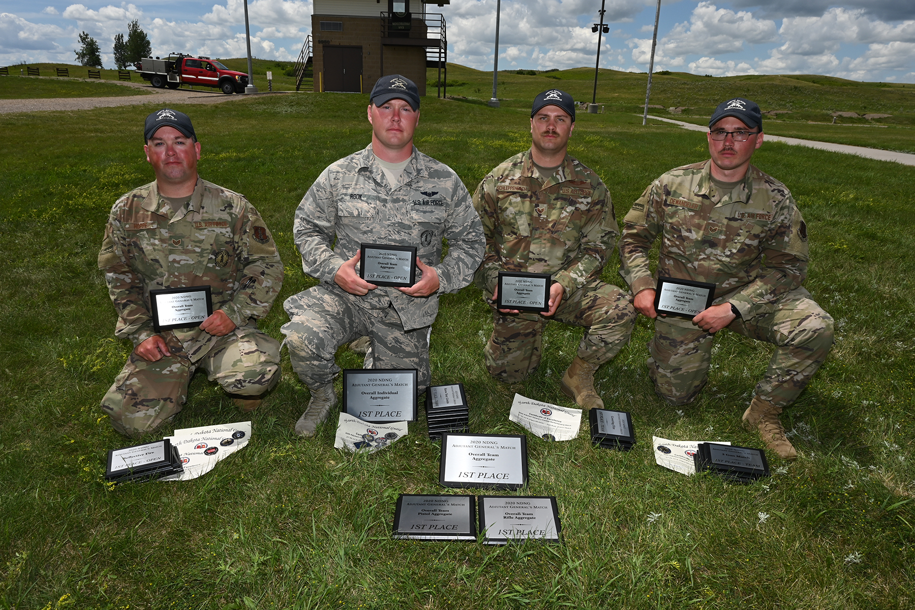 The 2020 Adjutant General’s Combat Marksmanship match was held July 10-12 at the Camp Grafton Training Center firing complex, near McHenry, N.D. This year eleven teams comprised of either four Soldiers or Airmen each, competed in the annual event. Marksmanship, an important component of lethality, improves our combat readiness. Participating in shooting matches enhances marksmanship skills which in-turn improves our abilities to train Soldiers and Airmen. On the last day of the competition, N.D. National Guard senior leaders participated in the shooting matches. Staff Sgt. Gavin Rook, of the 119th Wing, took first place in six individual categories, with Staff Sgt. Tyrel Hoppe, also 119th Wing, and Capt. Blake Hillerson, shooting with the 141st Maneuver Enhancement Brigade, taking first in the two remaining categories.