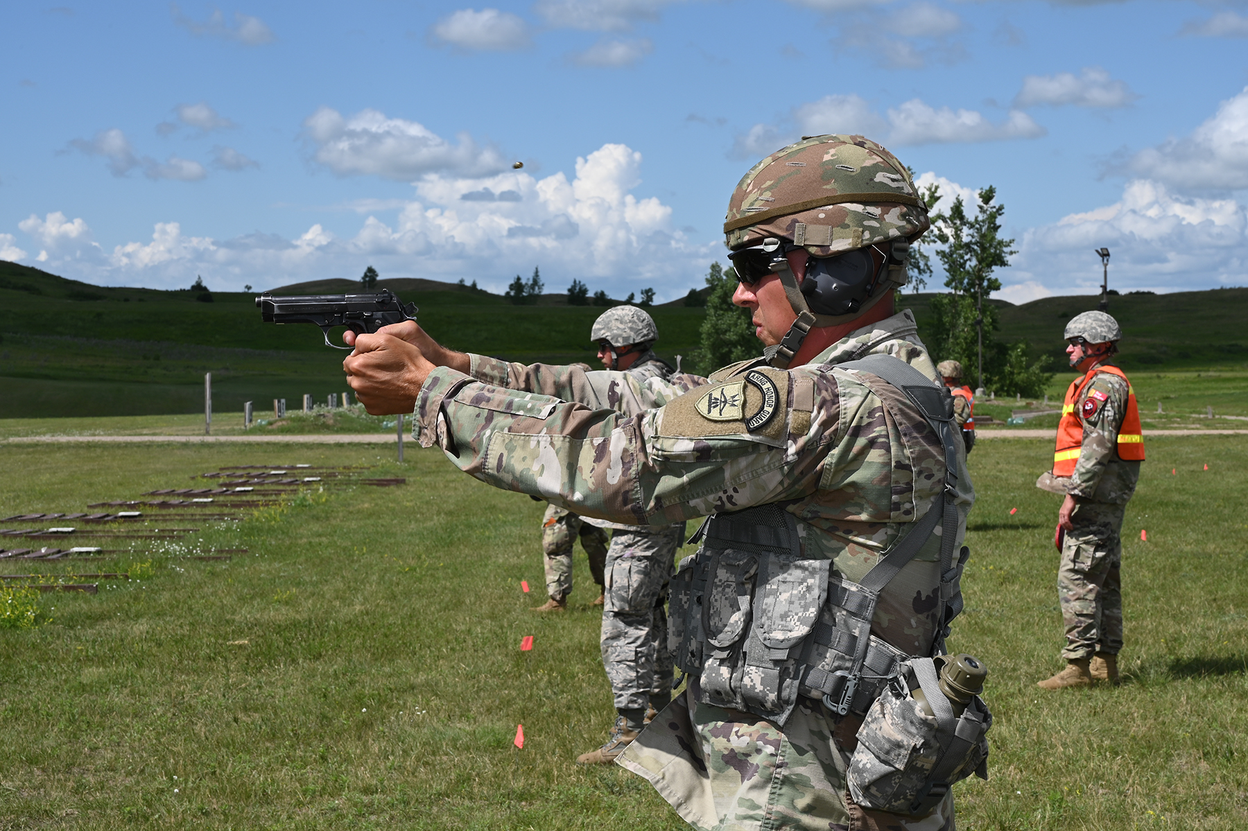 Command Sgt. Maj. Scott Obrigewitch, 164th Engineer Battalion, fires a M9 Beretta 9mm pistol during the 2020 N.D. National Guard Adjutant General Combat Marksmanship Match on July 11.