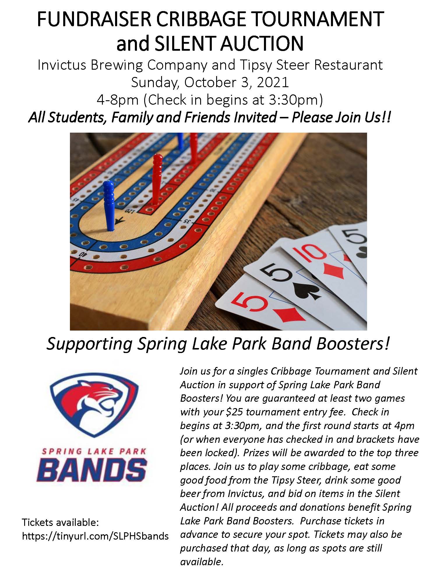 In combination with the Cribbage Tournament Fundraiser at Invictus Brewing Co. in Blaine, MN on Sun 10/3/2021, there will also be a silent auction, with all proceeds supporting Spring Lake Park High School Band Boosters. We would like to extend a HUGE thank you to the individuals and businesses for these generous donations! Bidding opens online the week prior to the event on the SLPHS Band Boosters Facebook page. To bid, just comment on the photo of the auction item with your bid and add additional comments for higher bids (please bid in whole dollar increments). On Sun 10/3/2021, at 3pm CDT, the highest current bid and bidder will be entered onto the bid sheet at the event, and bidding will continue both at the venue and online until bids close at 7pm Sun 10/3/2021. If online bids are the winning bids, winners will be contacted, and items can be picked up or delivered (if winner is local) as soon as payment is received. If the winner is not local, winner is responsible for shipping and items will be shipped as soon as payment is received. Please keep your eyes out in case additional items are added throughout the week as they become available. Make sure to "Like" the SLPHS Band Boosters Facebook page, and please share the album of fantastic silent auction items far and wide! THANK YOU and Happy Bidding!