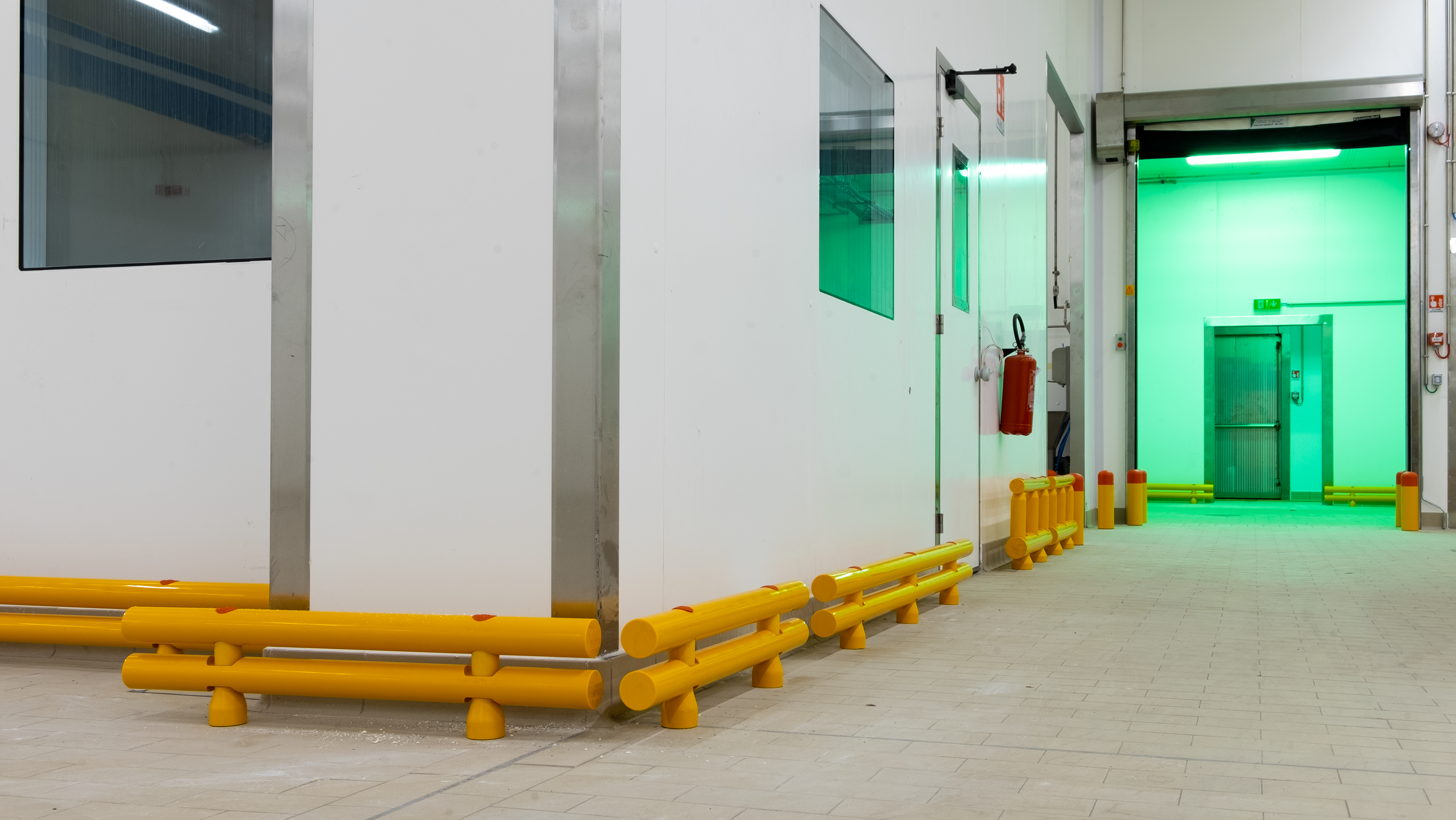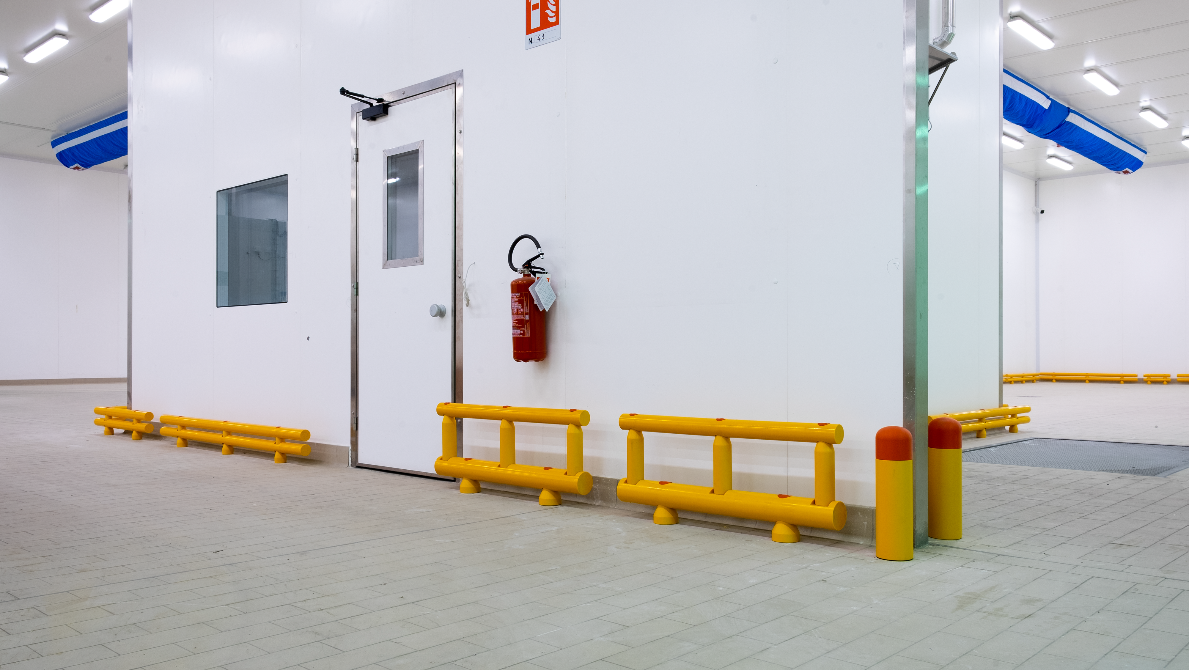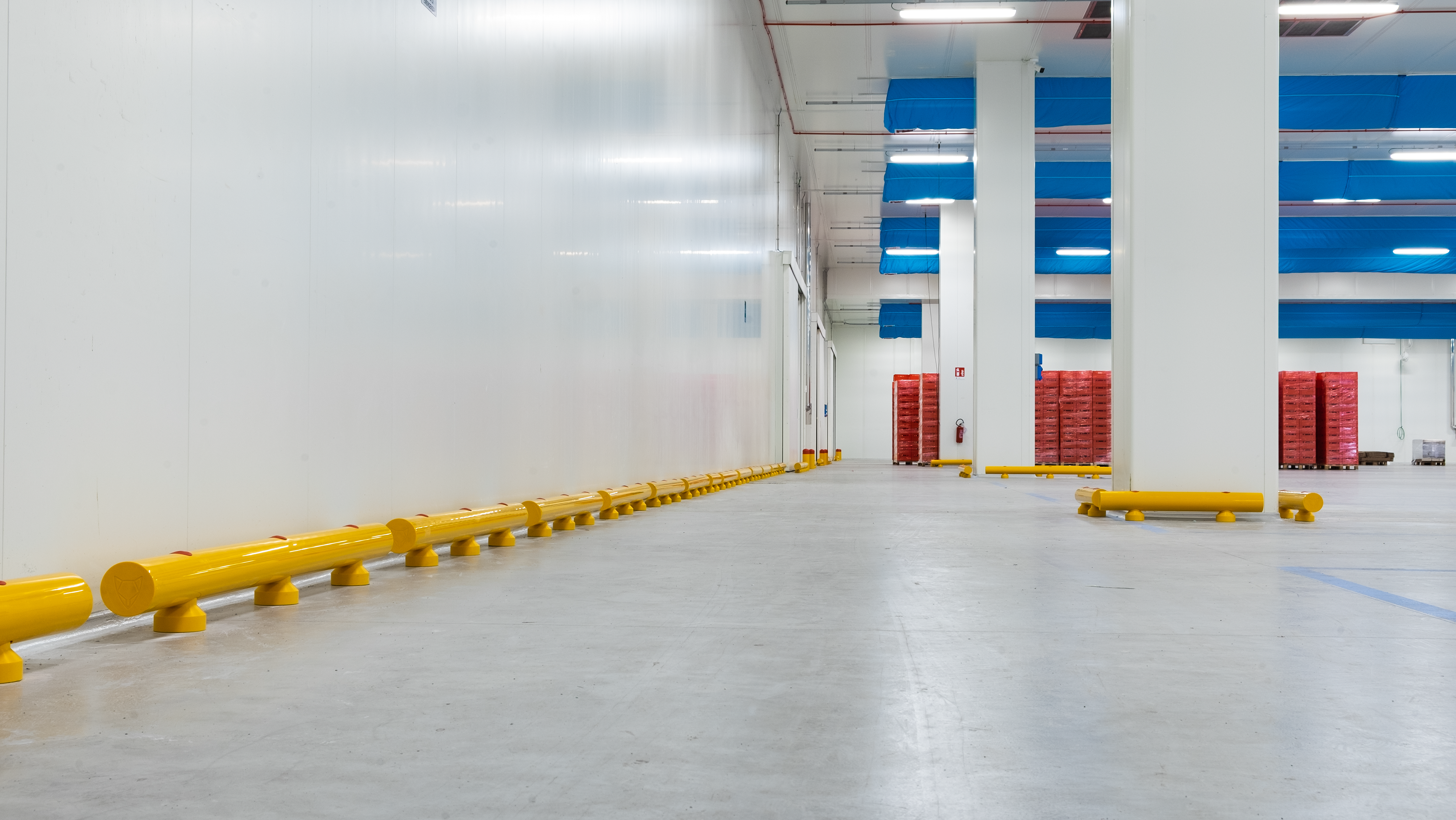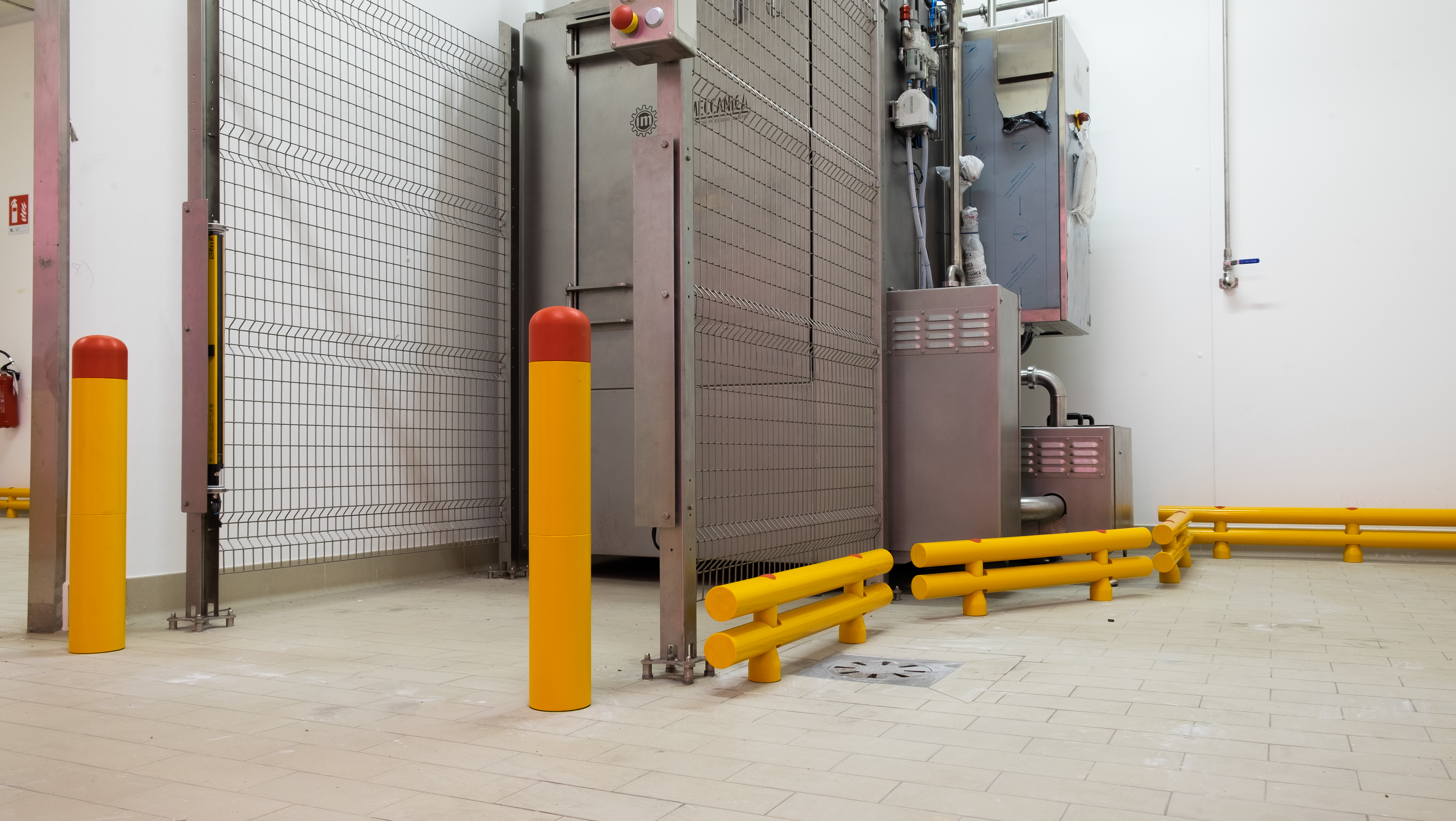 Le colonne e le pareti che circondano i macchinari sono elementi vulnerabili all’interno dello stabilimento Bencarni, poichè carrelli e transpallet possono colpirle danneggiandole vistosamente. Abbiamo protetto quest’area con i nostri Guardrail Antiurto, progettati e certificati per arrestare la corsa di un veicolo e trasferire l’energia d’impatto sprigionata al pavimento, senza che questo venga danneggiato.