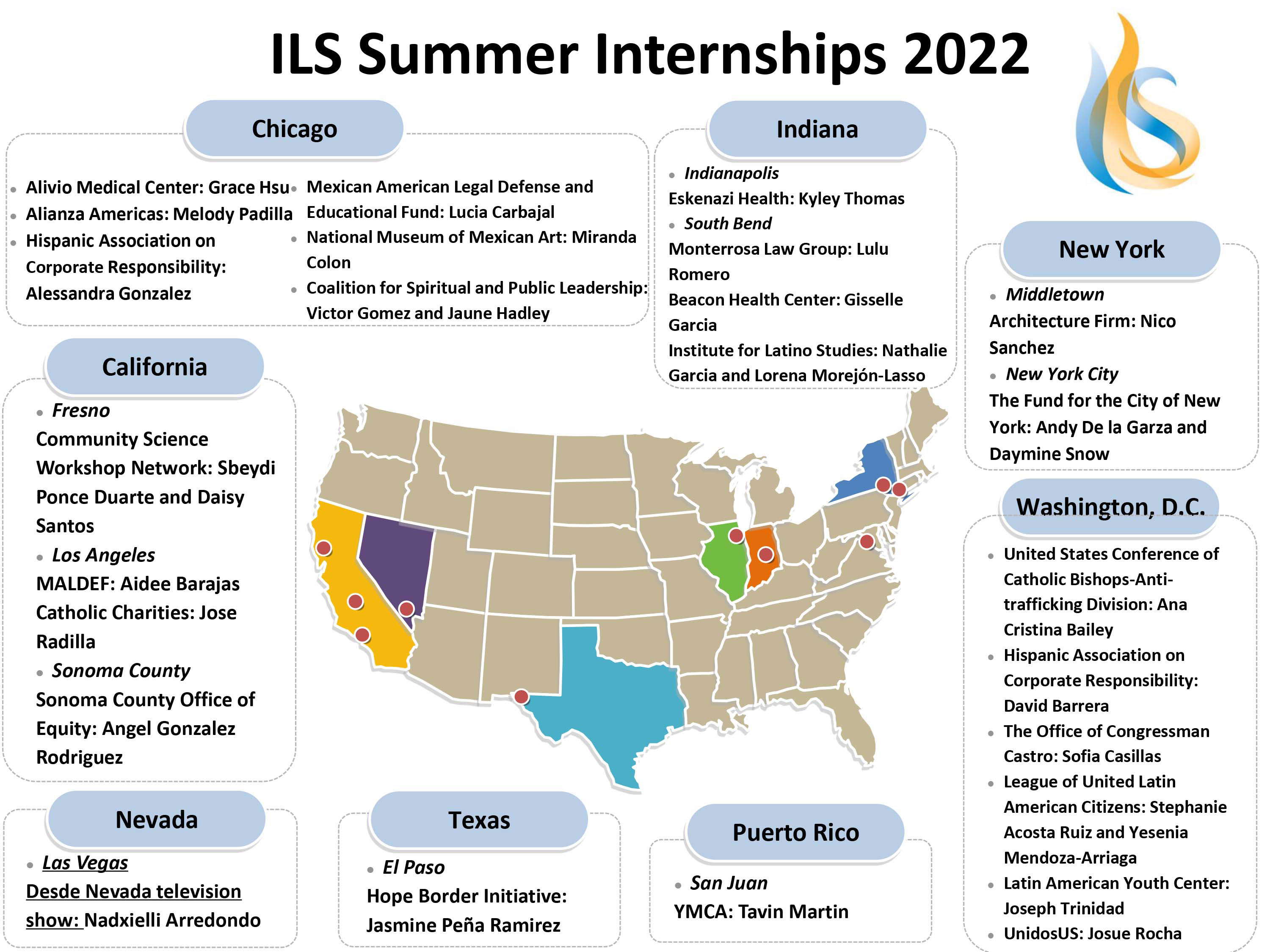 Internships spanned disciplines from technology to medicine, and arts to politics and law. Partner organizations included Univision, the Coalition for Spiritual and Public Leadership, UnidosUS, and the Mexican American Legal Defense and Educational Fund.