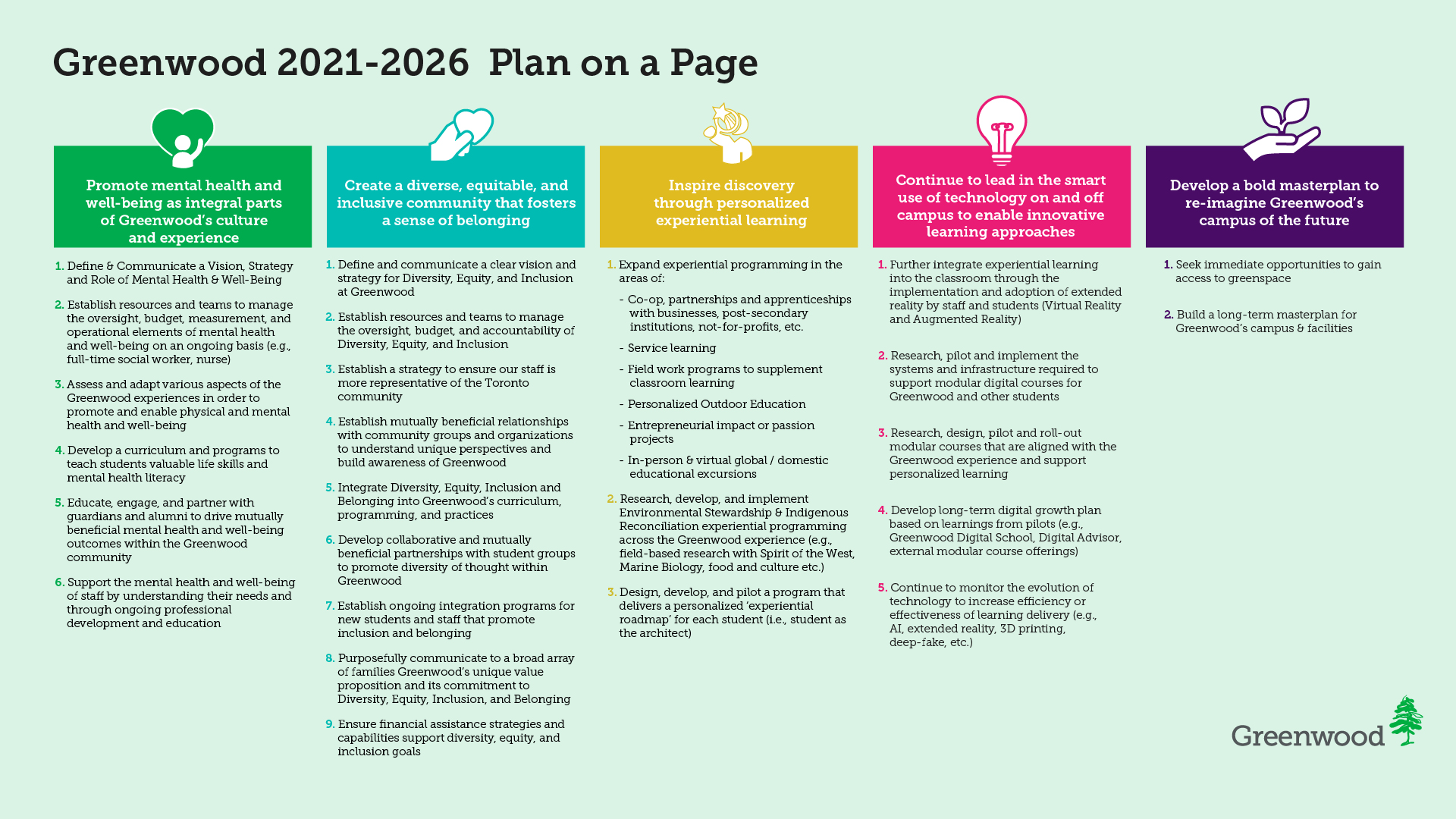 The enhancements to the Greenwood experience will be attained through the five imperatives outlined in this document, our roadmap for achieving this vision. This will require bold action across most everything we do: from the program we deliver to how we innovate, to how we hire, to how we fund our growth and aspirations. What will remain constant is the mission and the heart of Greenwood.