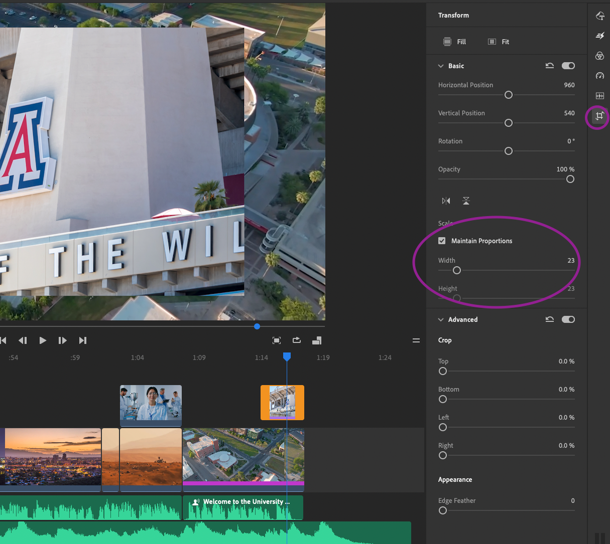 Activate the “Crop & Rotate” pane in the right-hand toolbar. Use the “Scale,” “Horizontal Position,” and “Vertical Position” features to resize and place your B-roll.
