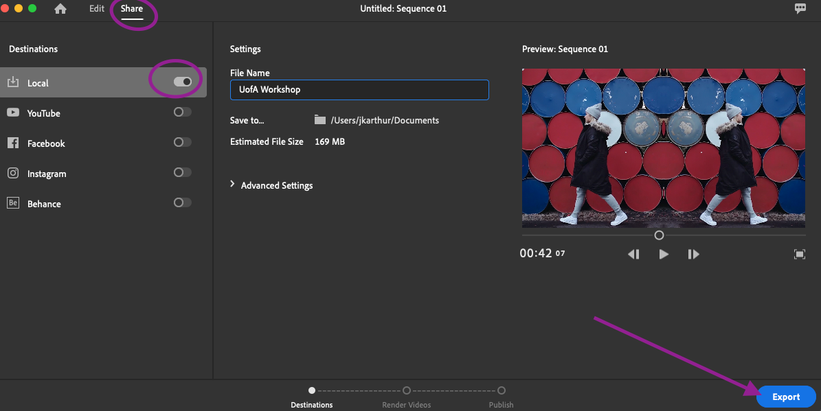 Toggle “Local” on, give your project a file name, save the project in your media assets folder, then click “Export.”