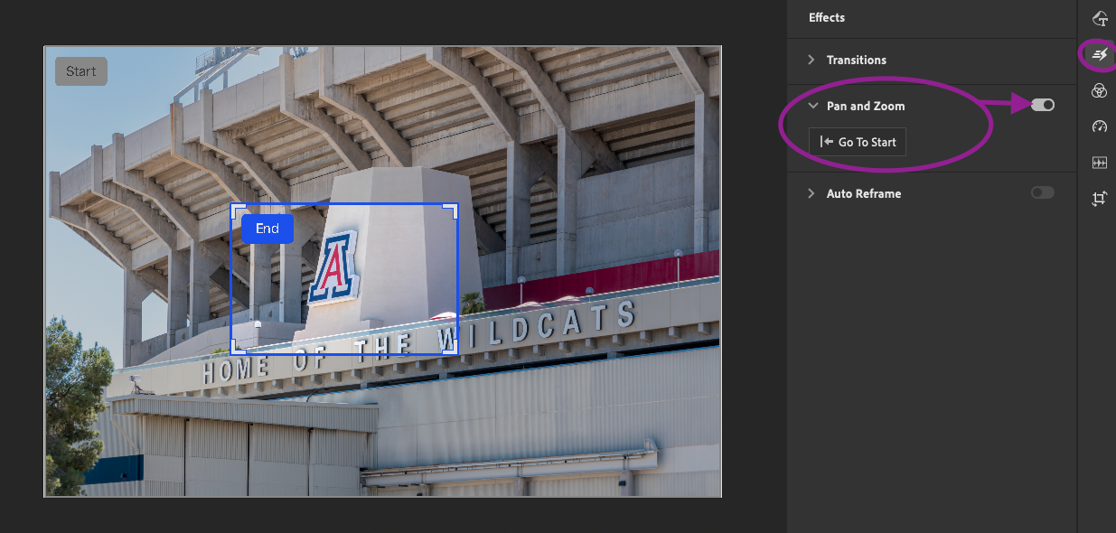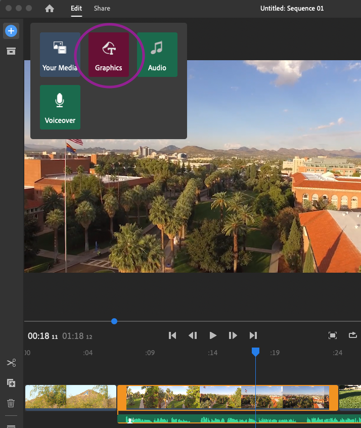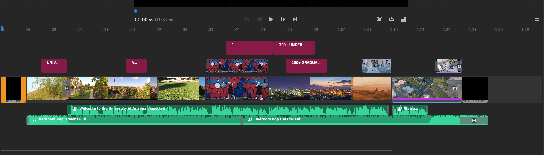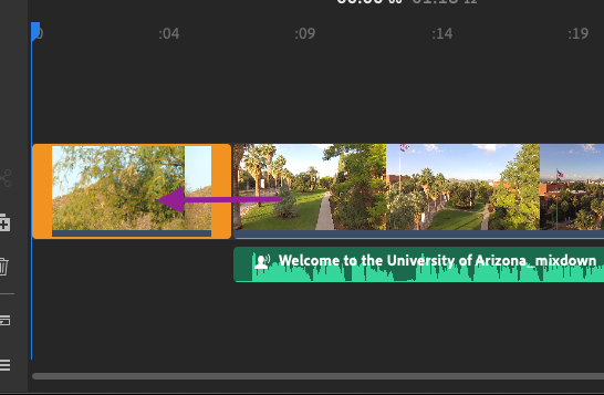 For more effective visual storytelling, add dynamic b-roll as the opening shot in the timeline. Do this by rearranging clips horizontally. Additionally, cut away to related visuals when the speaker in your Audio Narrative talks about the University.
