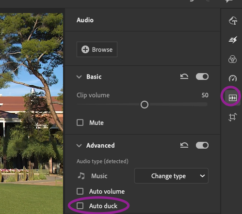 Balance the music volume by selecting the music track, activating the Audio panel in the right-hand toolbar, and selecting “Auto duck” under the “Advanced” pane.