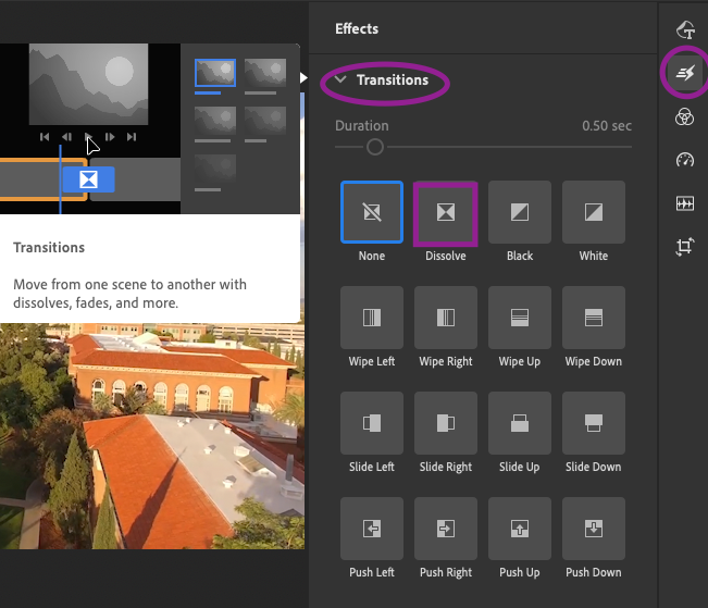 Typically, “Dissolve,” “Black,” and “White” are good transition options. To fit your preference, elongate or shorten transitions using the “drag and drop” editing method when you see transitions appear on clips.