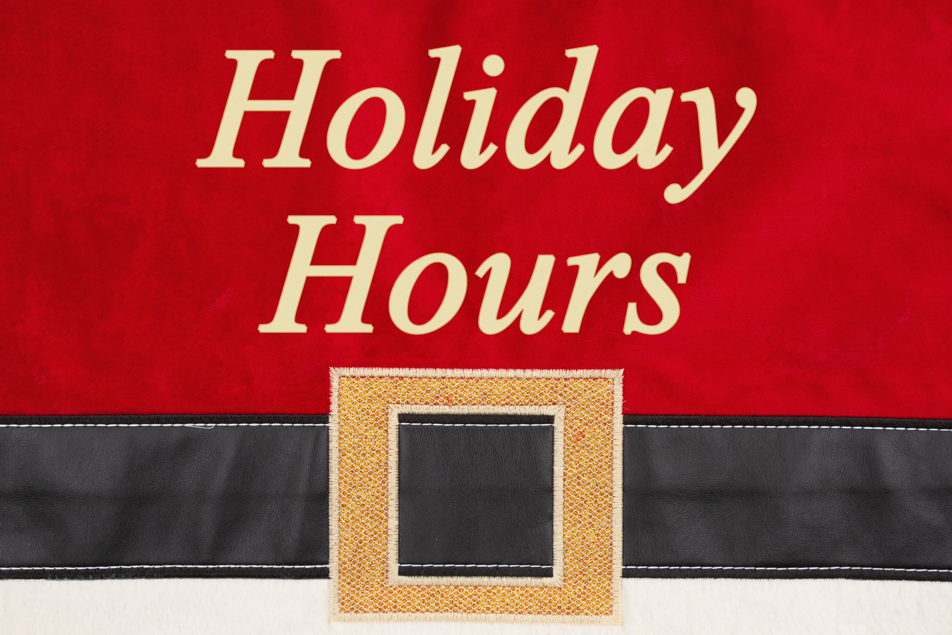 HOLIDAY HOURS: Christmas Eve: CLOSED Christmas Day: CLOSED New Year's Eve: 9am-2pm New Year's Day: CLOSED