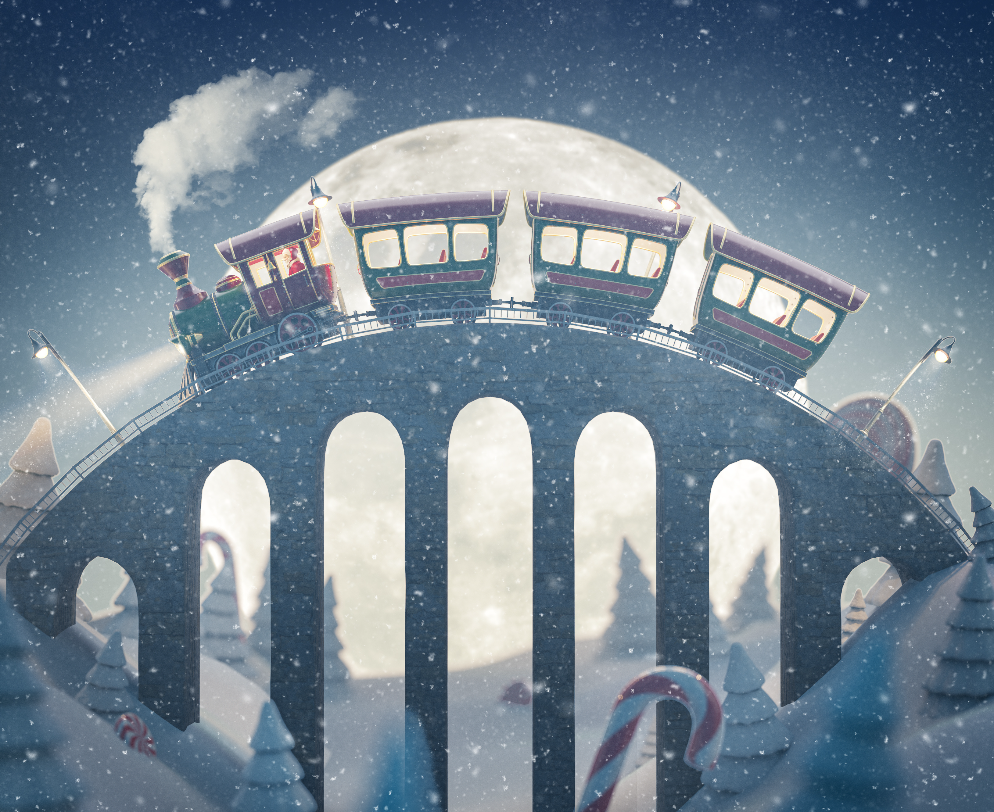 Created with images by LIGHTFIELD STUDIOS - "top view of colorful gift boxes in shape of christmas tree on green background" • ASTA Concept - "Amazing cute christmas train" • deagreez - "Portrait of serious hipster santa claus in red hat drive his scooter hurry rider ride to x-mas christmas party wear shirt suspenders isolated over yellow color background" • alswart - "Moon And Santas Sleigh Silhouette"