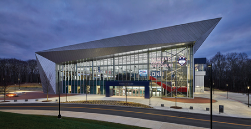 Traveling from the main campus along Jim Calhoun Way and viewed from an elevated perspective, the building makes a compelling statement. While material from the district’s surrounding structures were employed — glass, brick and metal panel threaded with accents of UConn blue — these elements were interpreted to express the kinetic nature of the sport of ice hockey. The building’s north-facing glass facade is set off by an angled configuration of metal panel inspired by the powerful gesture of skate blades, evoking the precision required to thrive, as well as the drive and discipline it takes to win on the ice.