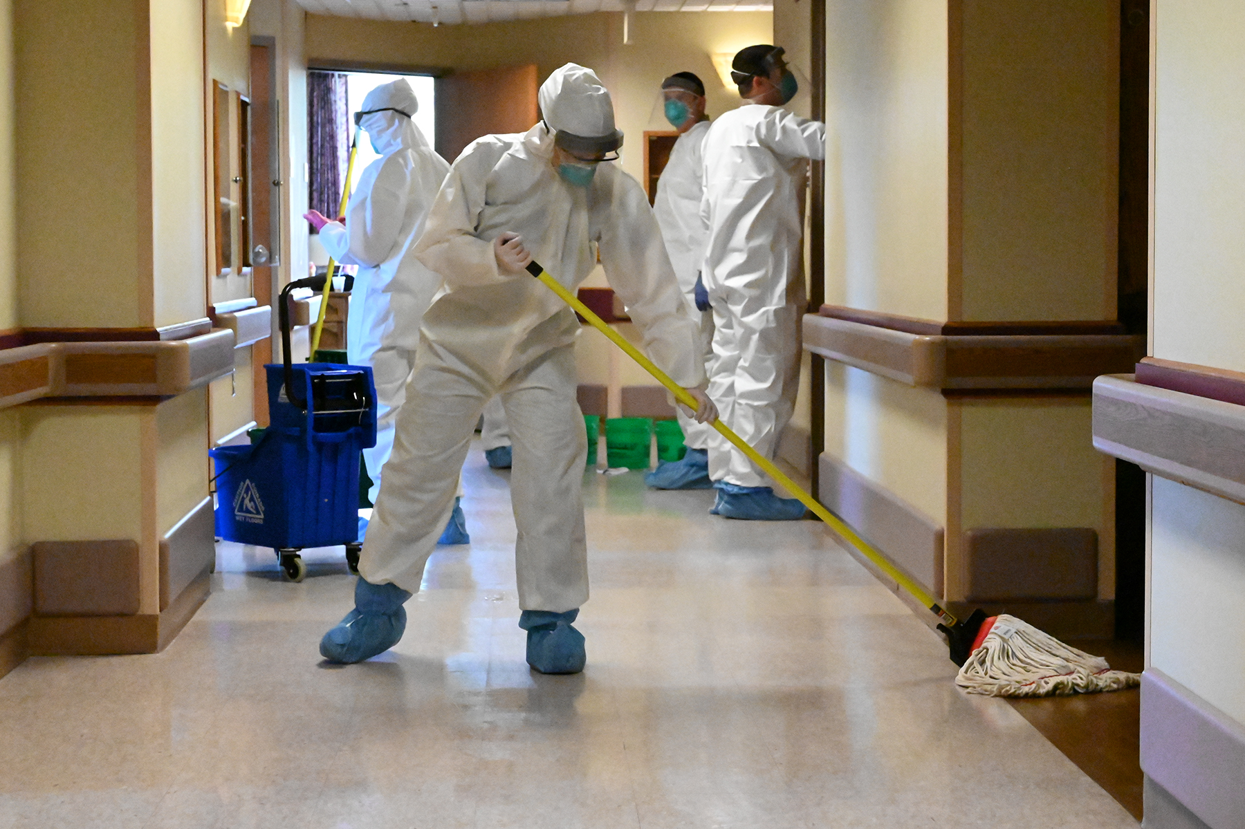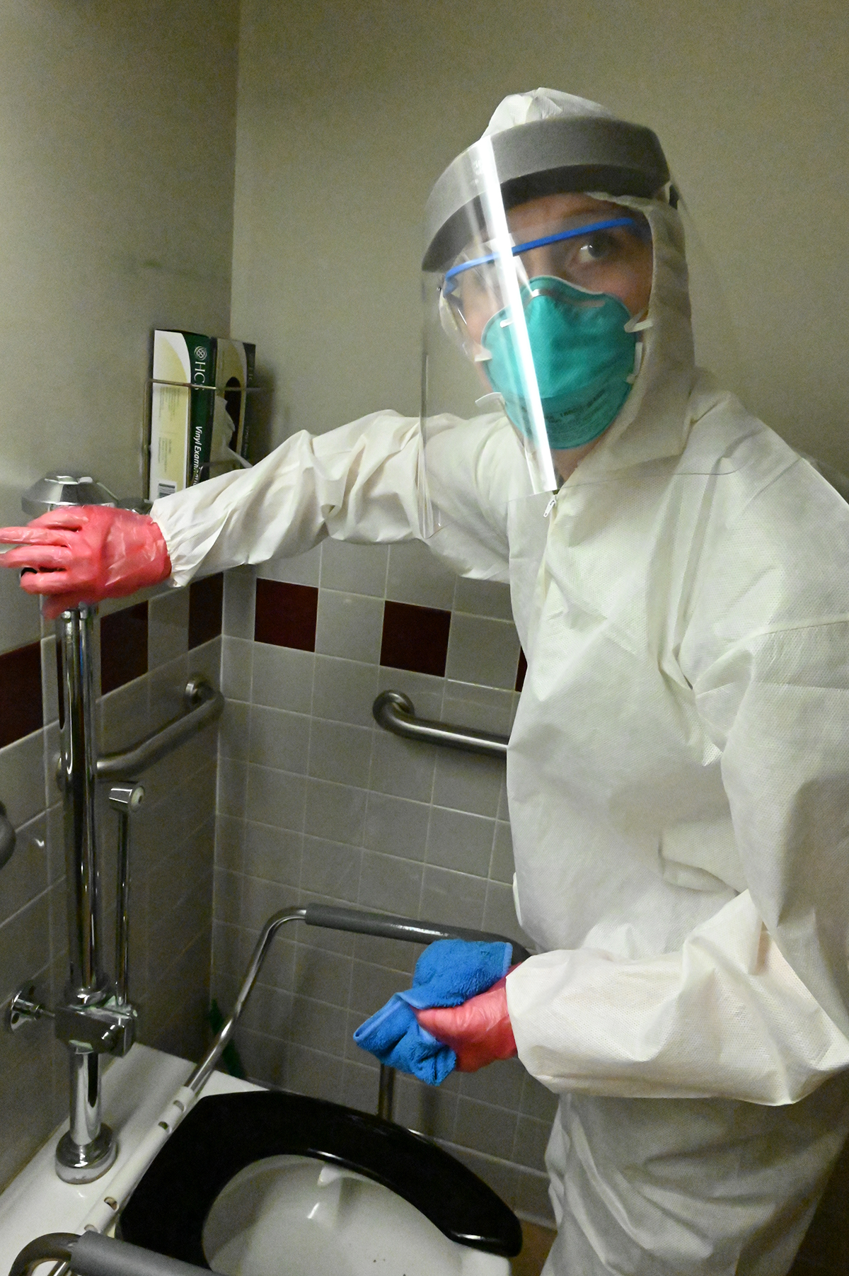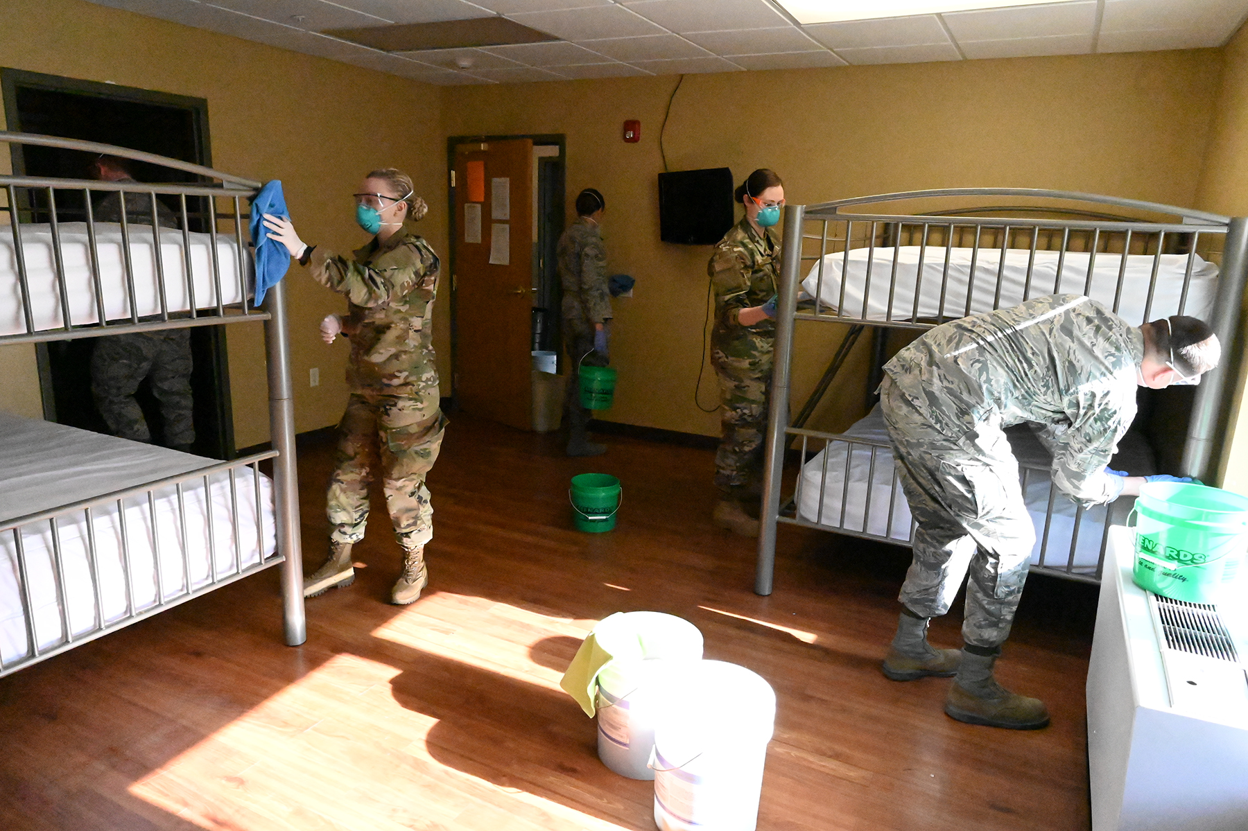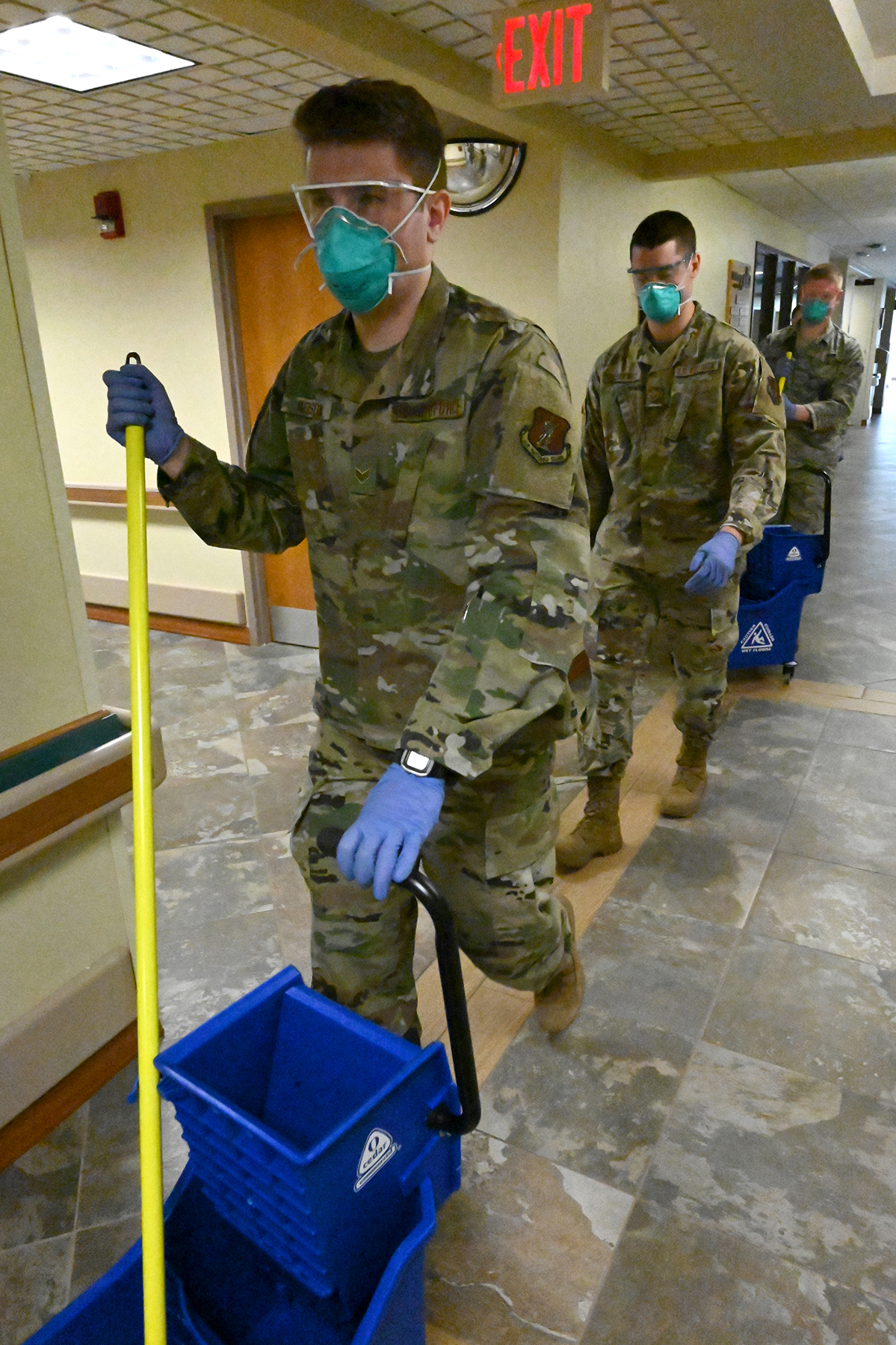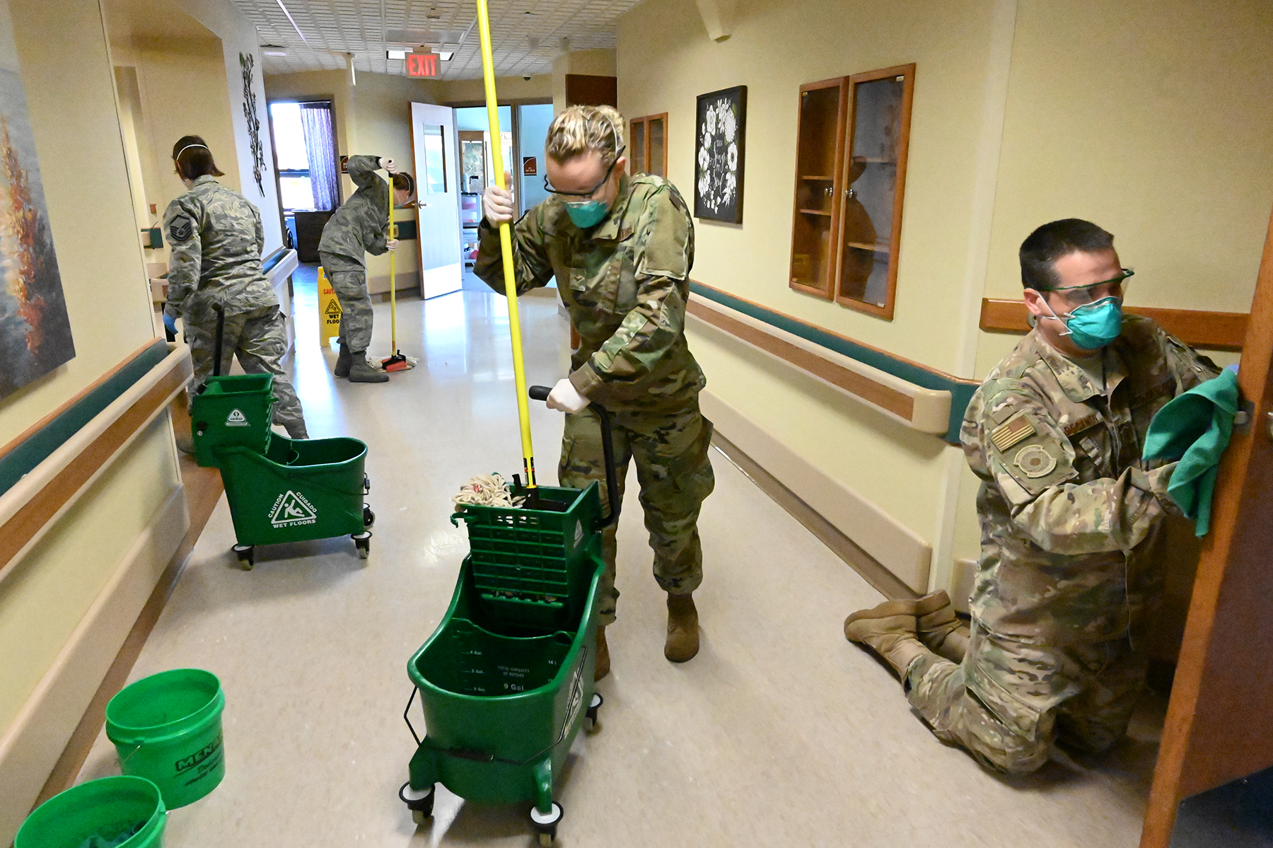 N.D. National Guard Airmen wipe surfaces with sanitizing material and mop floors as they assist a contractor in ‘deep cleaning’ a Fargo congregate living facility on May 18.