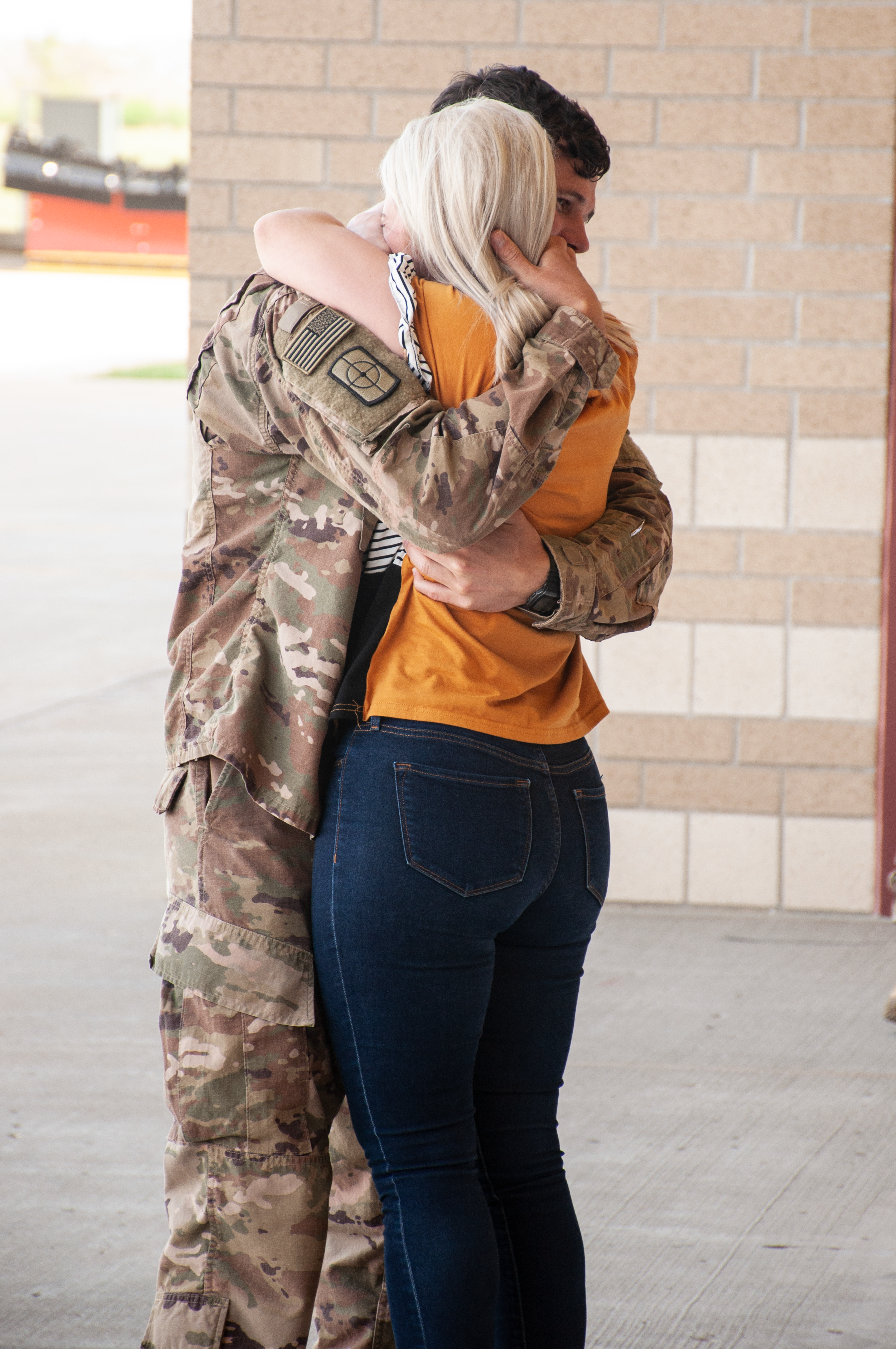 1st Lt. Ryan Blumhagen hugs his wife Mckenzie after arriving at the at the N.D. National Guard's Army Aviation Support Facility in Bismarck on May 20. Blumhagen led a six Soldier-team of the Bismarck-based 957th Engineer Company (Multi-role Bridge) serving in Iraq assisting Iraqi army bridge engineers.