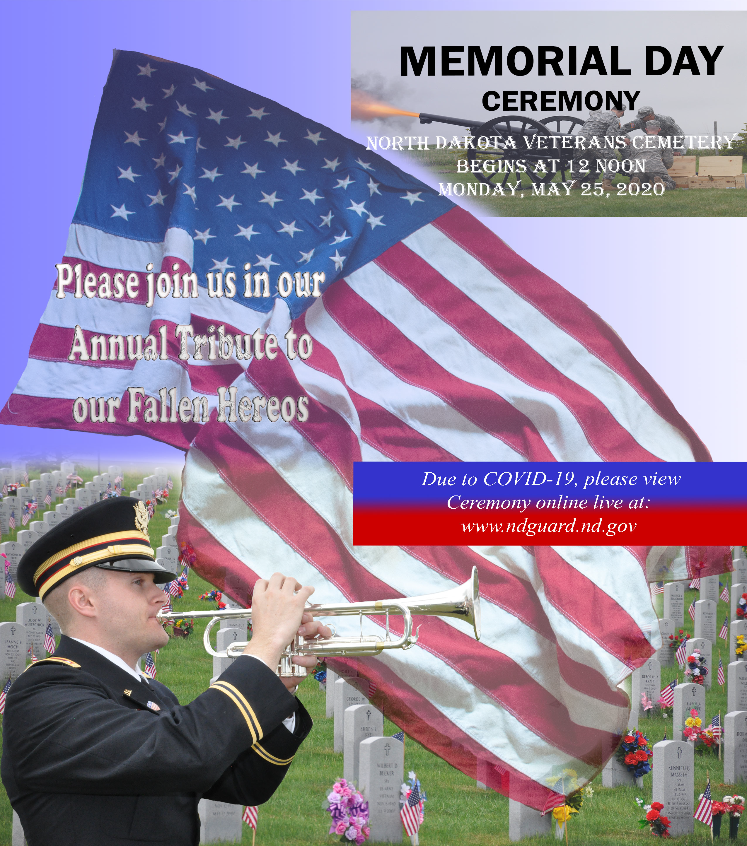 Due to COVID-19 restrictions our annual 2020 Memorial Day ceremony at the N.D. Veterans Cemetery will only be available online. Please join us for the broadcast of the ceremony live on our website NDGuard.nd.gov beginning at 12 noon on May 25.