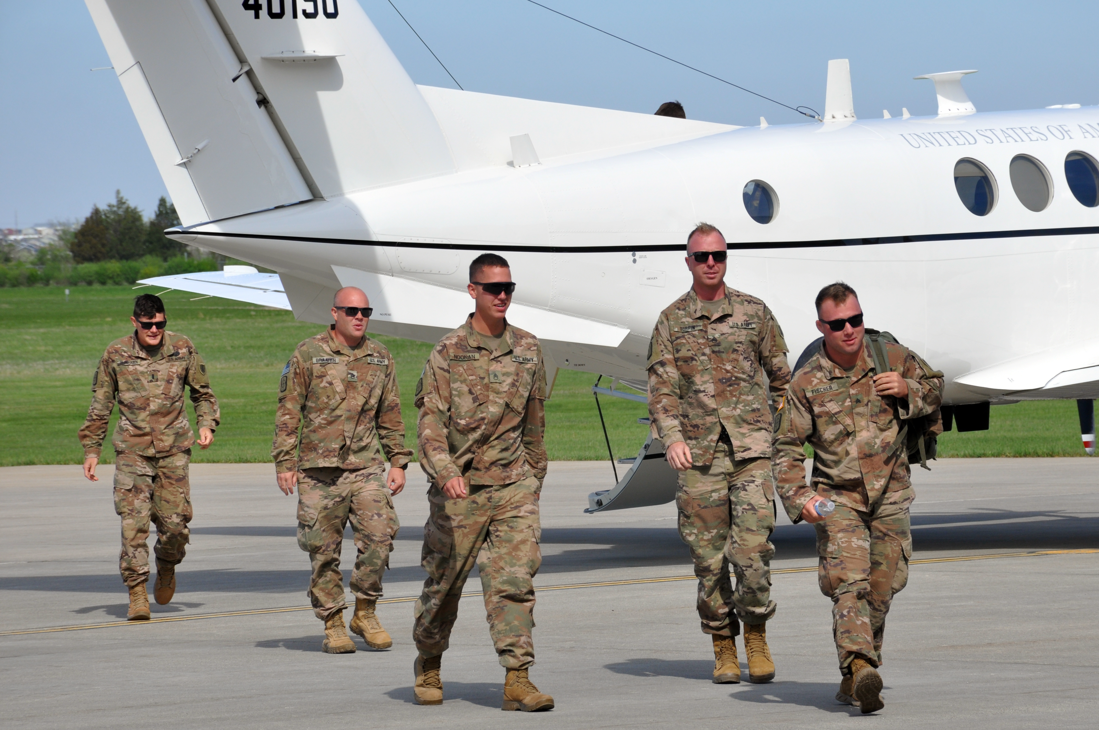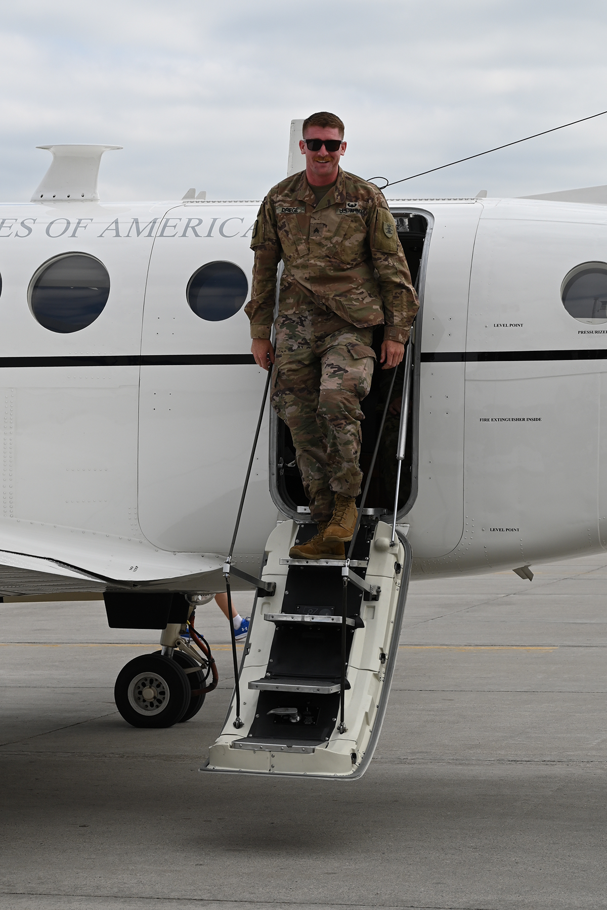 Sgt. Casey Drege steps off of the C-12 Huron in Fargo on May 20. Drege was one of six Soldiers from the 957th Engineer Company (Multi-role Bridge) who returned home to North Dakota on May 20 after serving overseas in Iraq. The aircraft later transported the remaining five Soldiers to Bismarck.