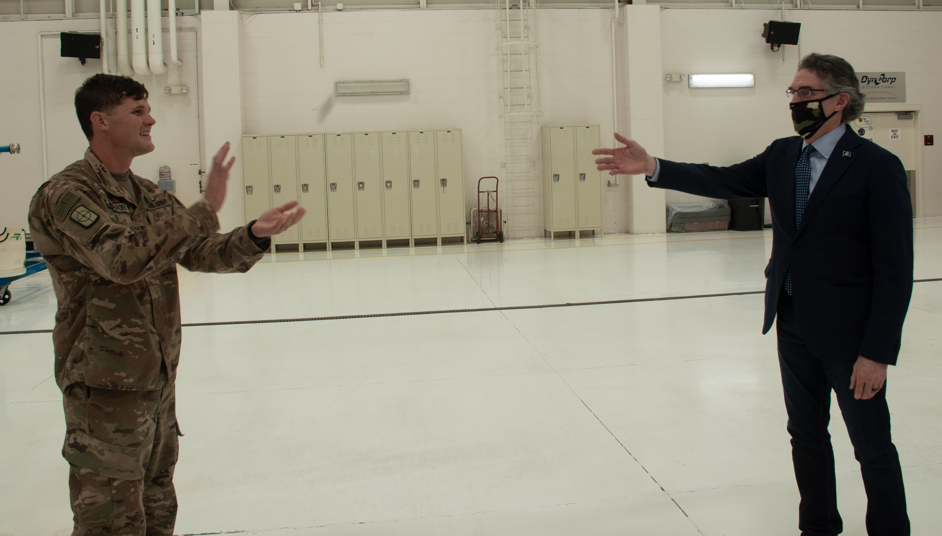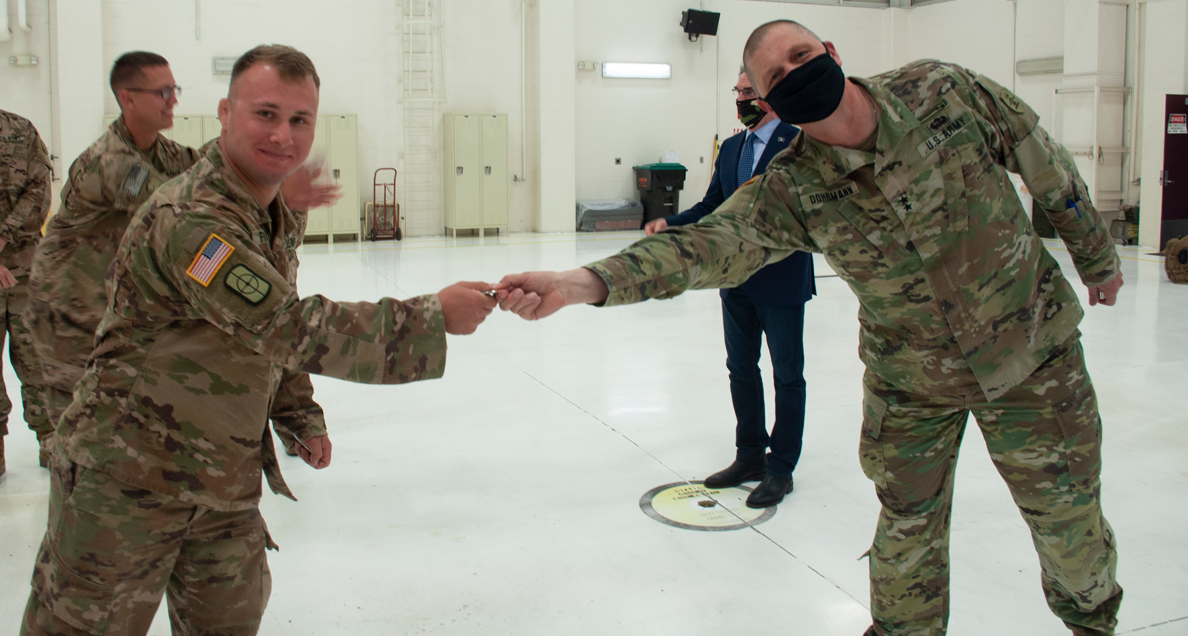 A six Soldier-team of the Bismarck-based 957th Engineer Company (Multi-role Bridge) returned to North Dakota on May 20 after serving on an overseas deployment. One of the Soldiers was dropped off in Fargo, while the other five traveled to the N.D. National Guard's Army Aviation Support Facility in Bismarck. Gov. Doug Burgum, Maj. Gen. Al Dohrmann, family and fellow service members greeted them inside the C-12 hanger. The engineers, mobilized in June 2019, assisted in the training of Iraqi army bridge engineers. Among their major accomplishments was developing an Program of Instruction (POI) for the Harzone Panel Bridge.