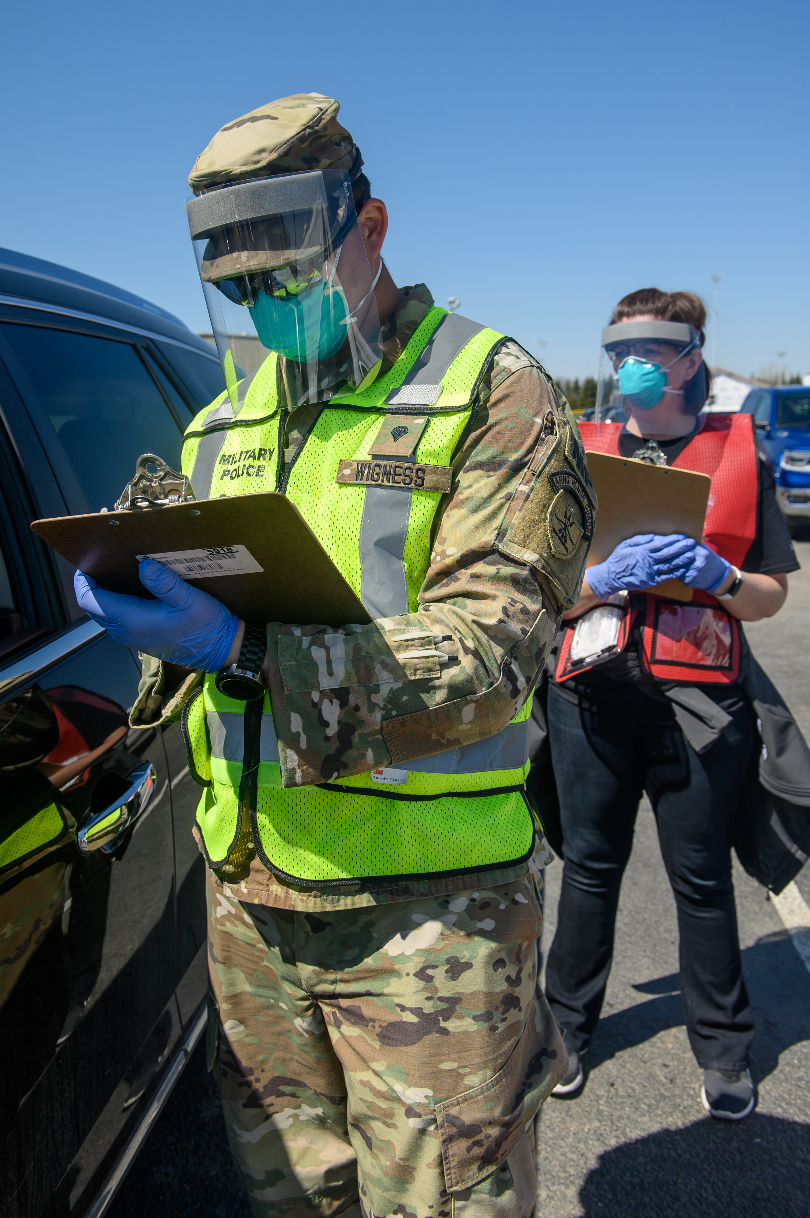 Capt. Justin Huber, 816th Military Police Company, puts data collection forms into a clipboard at the COVID-19 mobile testing site in Devils Lake on May 17.