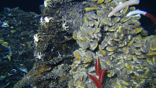 Welcome Photo 深海底熱水活動域の生態系 (Photo courtesy of Stefan Sievert, WHOI/NSF/HOV Alvin, © Woods Hole Oceanographic Institution)