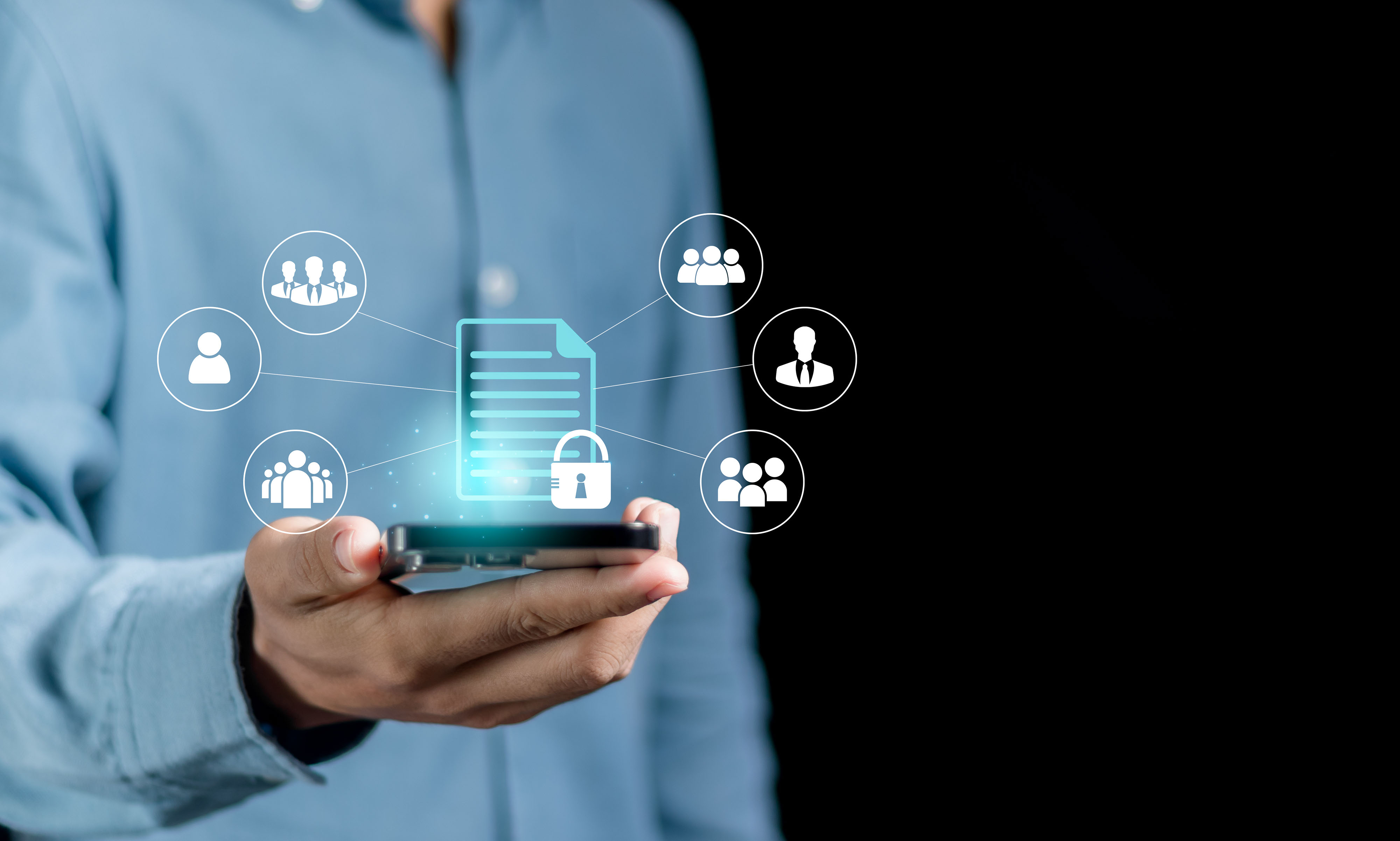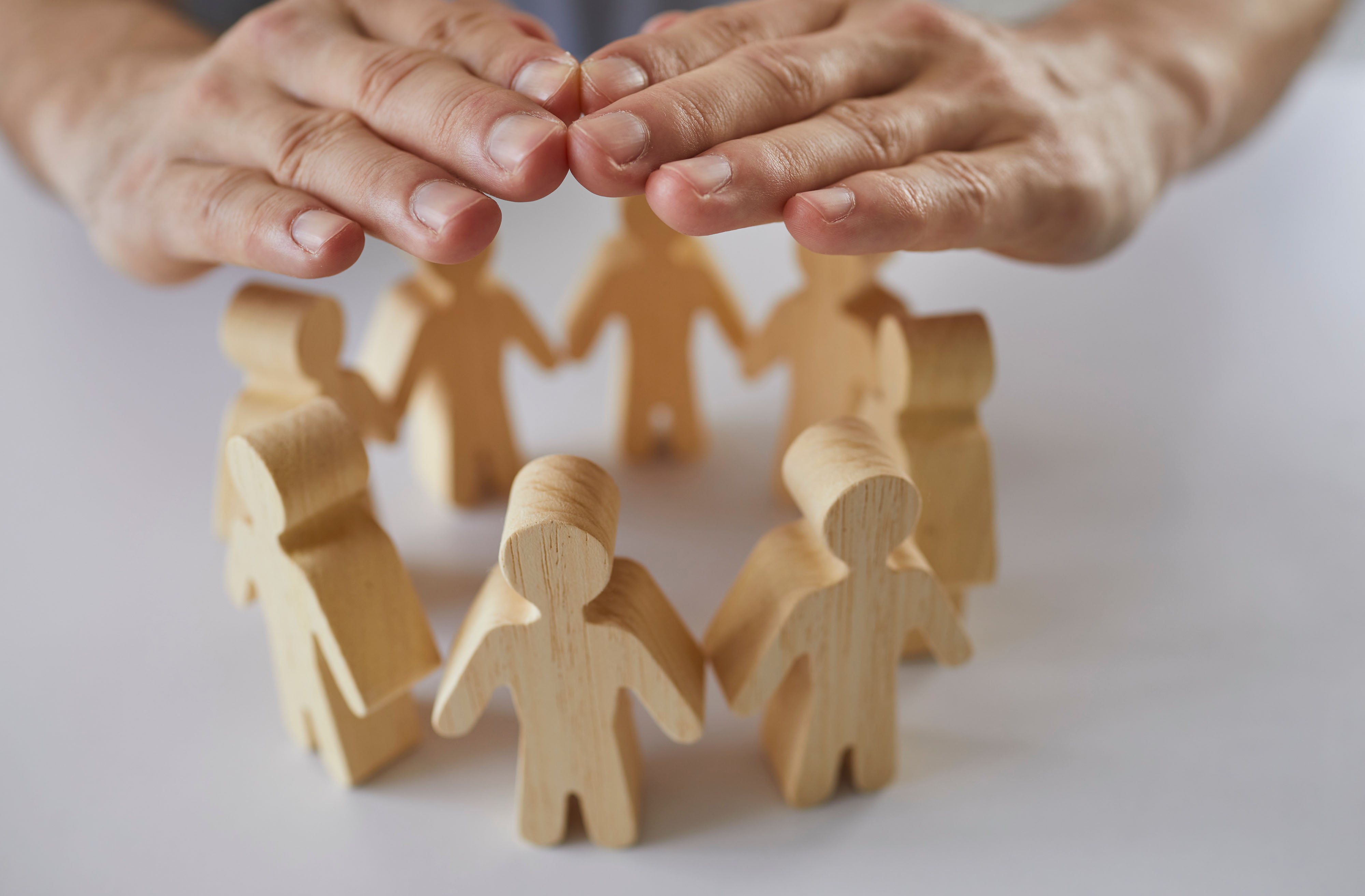 Created with images by Andrii Yalanskyi - "Boss defending his team with a gesture of protection.,Life insurance.,Customer care, care for employees.,Security and safety in a business team.,Human resources.,A responsibility.,Social protection" • Studio Romantic - "Insurance agent's hands cover and protect wooden figures of people standing in circle in front of him.,Close up of hands creating roof over human figurines as symbol of providing social protection." • vegefox.com - "net" • Pakin - "Document management with secure access, enterprise information management system (DMS), file access information, enterprise document sharing." • peshkova - "people talking in social network" • meeboonstudio - "Businessman protecting data personal information on a virtual interface.,Data encryption."