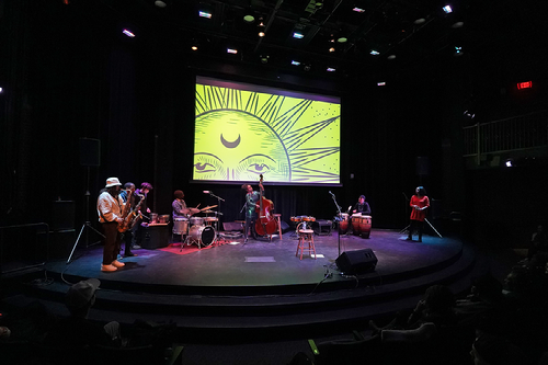 In February 2024, Nite Bjuti (pronounced night beauty) joined on campus for a three-day residency. Nite Bjuti is Candice Hoyes, Val Jeanty and Mimi Jones, an improvised trio of Afro-Caribbean artists using electronics, vocalism, bass, Haitian drum rhythms, sampling and spoken word to cultivate their narrative journey.