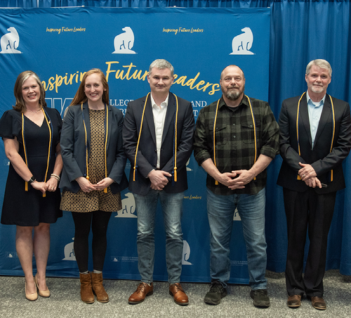Distinguished CBSM faculty pose for a photo after receiving their honor cords, Amy Cooper, Amanda Langhorst, Alec Bennett, Troy Bouffard, and John Pennington. Photo by Sarah Lewis