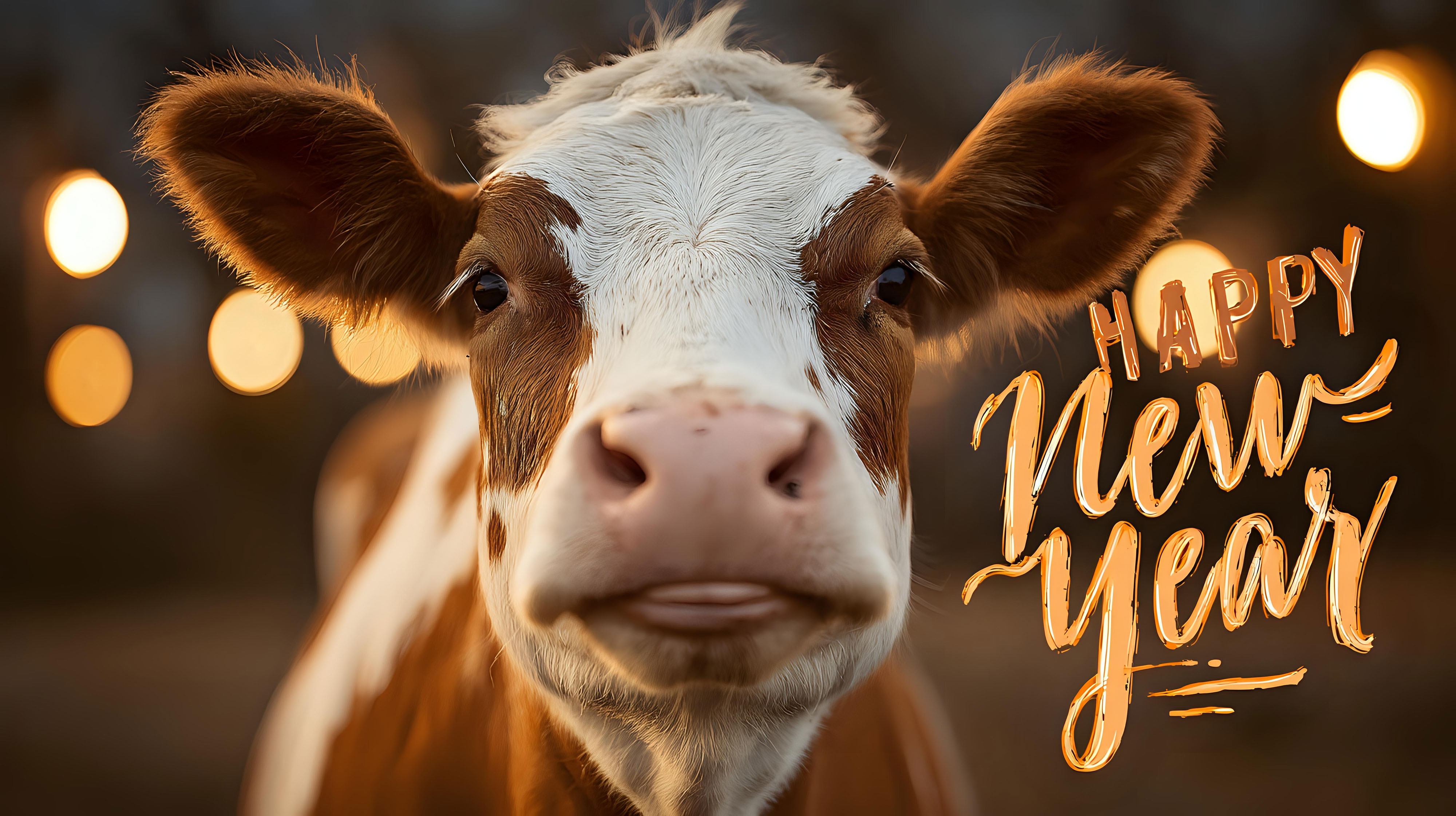 Created with images by afrah - "Funny cow portrait with bokeh lights and Happy New Year text festive animal photo for holiday greeting cards and social media posts" • Toseef - "A christmas tree farm with rows of snow covered evergreens twinkling lights and a festive barn, AI Generated" • Flaffy - "Autumn composition. Dried leaves, flowers, rowan berries on white background. Autumn, fall, thanksgiving day concept. Flat lay, top view, copy space" • Leika production - "Guy gardener in garden gloves puts the pots with seedlings in the white wooden box on the table and a girl prunes plants in the wonderful nursery-garden on a sunny day." • aga7ta - "watercolor painting background"