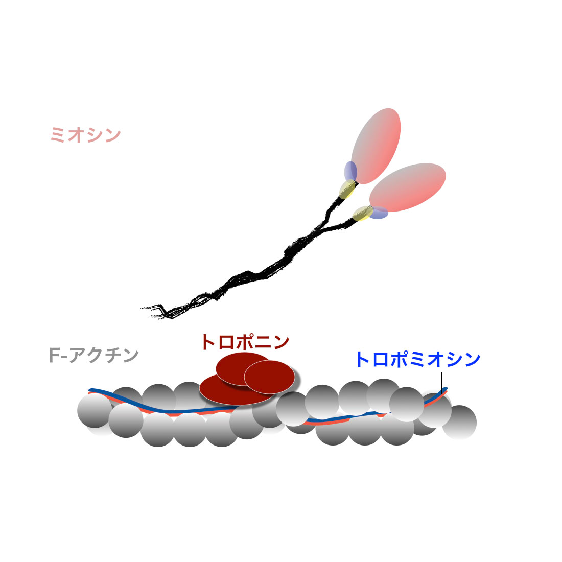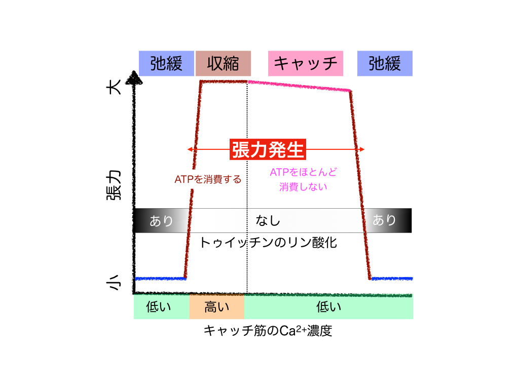 キャッチ運動には、トゥイッチンと呼ばれるタンパク質が関与していることが明らかになり、その仕組みが分子レベルで説明できるようになりました。簡単に説明すると、トゥイッチンがミオシンおよびF-アクチンと複合体を形成するとキャッチ状態となります。この状態は、トゥイッチンがリン酸化されることによって、ミオシンがF-アクチンから離れて弛緩状態となり解除されます。その後、細胞内のCa2+濃度の上昇とトゥイッチンの脱リン酸化によりミオシンとF-アクチンが作用するようになり、筋肉は収縮します。その後、Ca2+濃度が低下すると再びキャッチ状態となると考えられています(Siegman et al. 1998; Funabara et al. 2003)。
