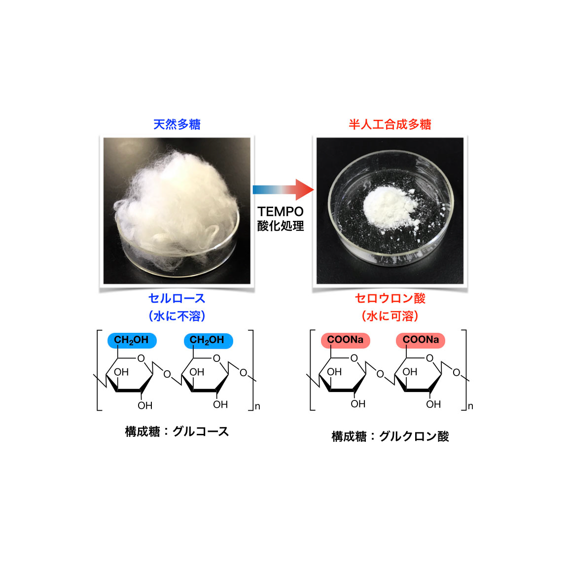 最近、ホタテガイの中腸腺から予想されていなかった酵素が発見されました。それは、セロウロン酸(β-1,4-グルクロン酸)と呼ばれる多糖を分解する酵素です。セロウロン酸とは、地球上に最も多く存在する多糖類のセルロースを化学的にTEMPO(2,2,6,6-テトラメチルピペリジン-1-オキシル)酸化処理を行うことで得られる水溶性多糖類です(Isogai & Kato 1998)。TEMPO酸化セルロースを調製する方法で、セルロースナノファイバーを得ることもできることから、現在注目されている素材の一つです。セロウロン酸は、自然界に存在するセルロースに人工的な処理を施して得られる多糖類のため、半人工合成多糖とも呼ばれています。部分的にアセチル化されているβ-1,4-グルクロン酸や局所的にβ-1,4-グルクロン酸構造をもつ多糖が天然に存在することは知られていますが、セロウロン酸と同一の構造をもつ多糖は未だに自然界で発見されていません。そのため、自然環境に流出した際に生物が分解できるのかについては、生産技術の確立後、早急に取り組むべき課題となりました。