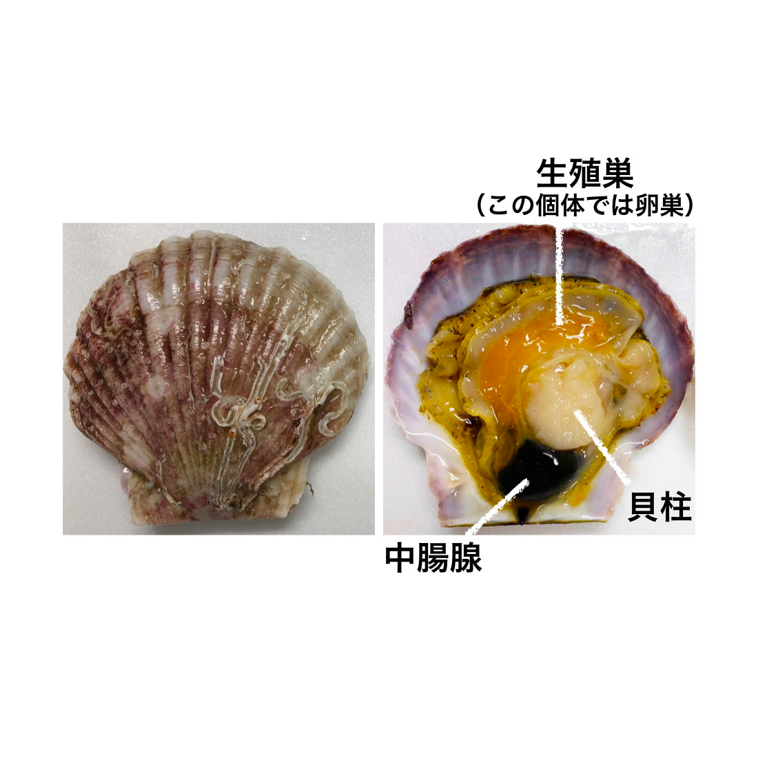 ホタテガイを剥くと貝殻の中央下部に暗褐色の組織が見られます。”ウロ”とも呼ばれるこの部位は、プランクトンの毒やカドミウムなど重金属類が蓄積しているため、食べられることはなく廃棄物として取り扱われます。学術的には中腸腺と命名されており、肝臓や膵臓の機能を併せ持つことから肝膵臓とも呼ばれます。摂餌したものを消化するための消化酵素の分泌や栄養の吸収および貯蔵を担う器官です。