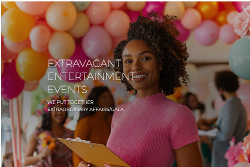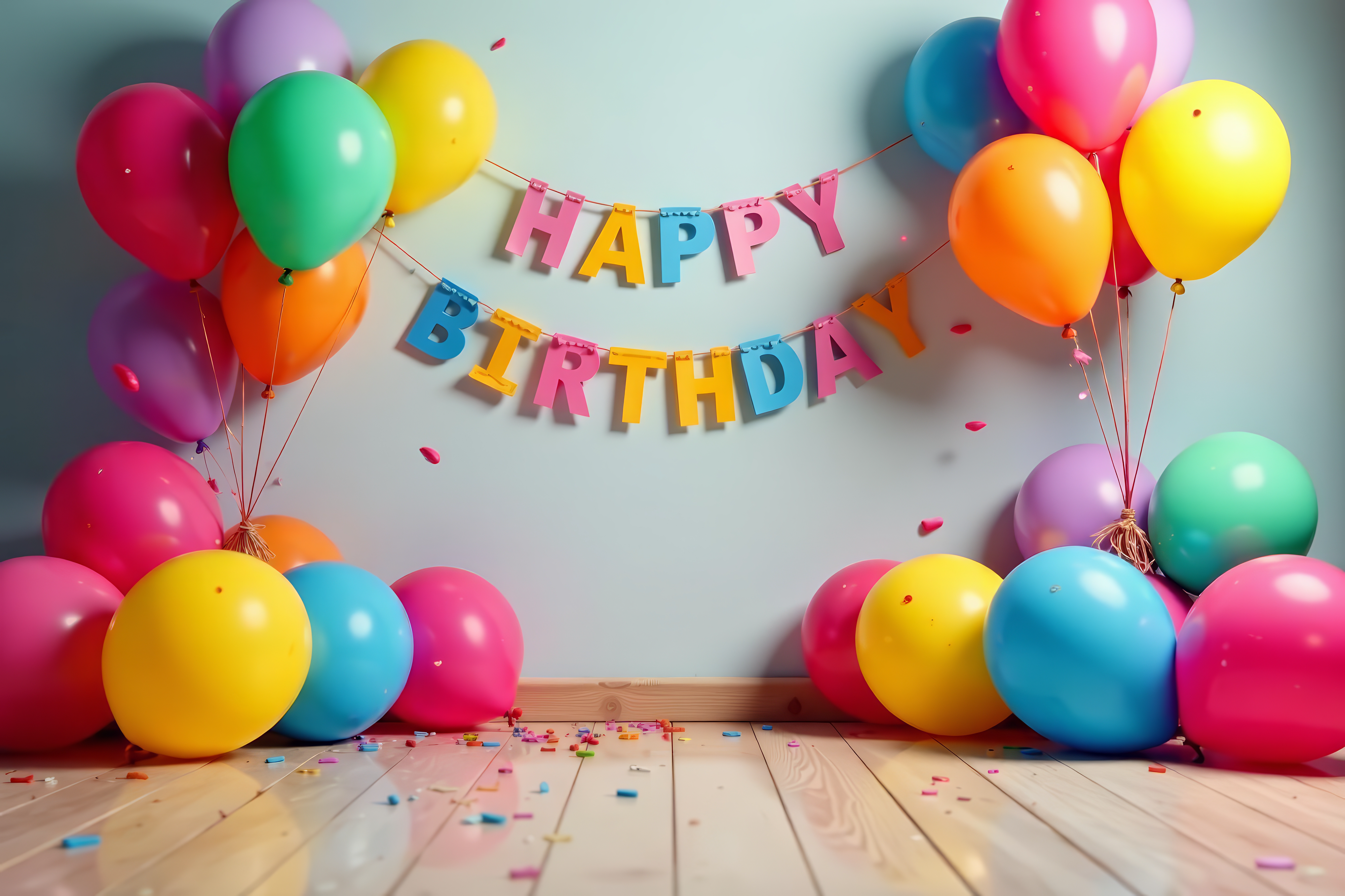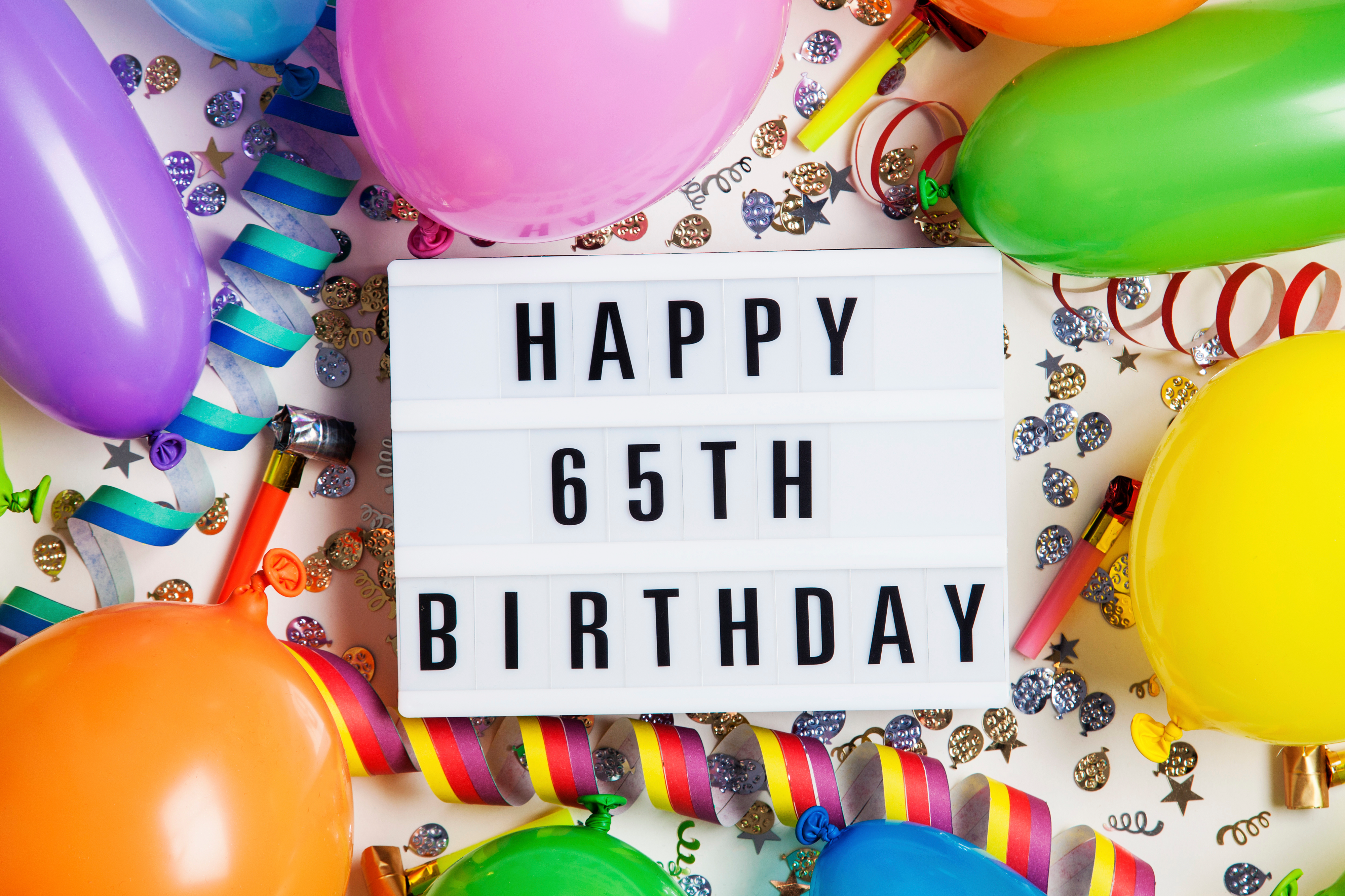 Created with images by Allen Hill, Fernandra Fowler, Ken Kashuba, Black cat studio - "A vibrant event planner with a clipboard, surrounded by colorful decorations, busy guests." • ink drop - "Happy 65th birthday celebration message on a lightbox with balloons and confetti" • Lalita - "Colorful balloons on floor with happy birthday banner, joyous celebration, festive, party, happy", and https://giphy.com/search/dancing