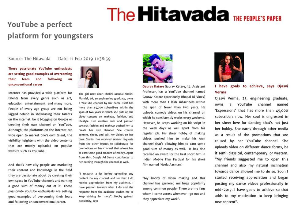 - Featured newspaper article ‘YouTube a perfect platform for youngsters’ by The Hitavada, 11th Feb Jan’19