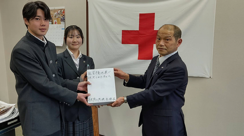 集まったお金を、生徒会長と副会長が赤十字社へ持っていきました。