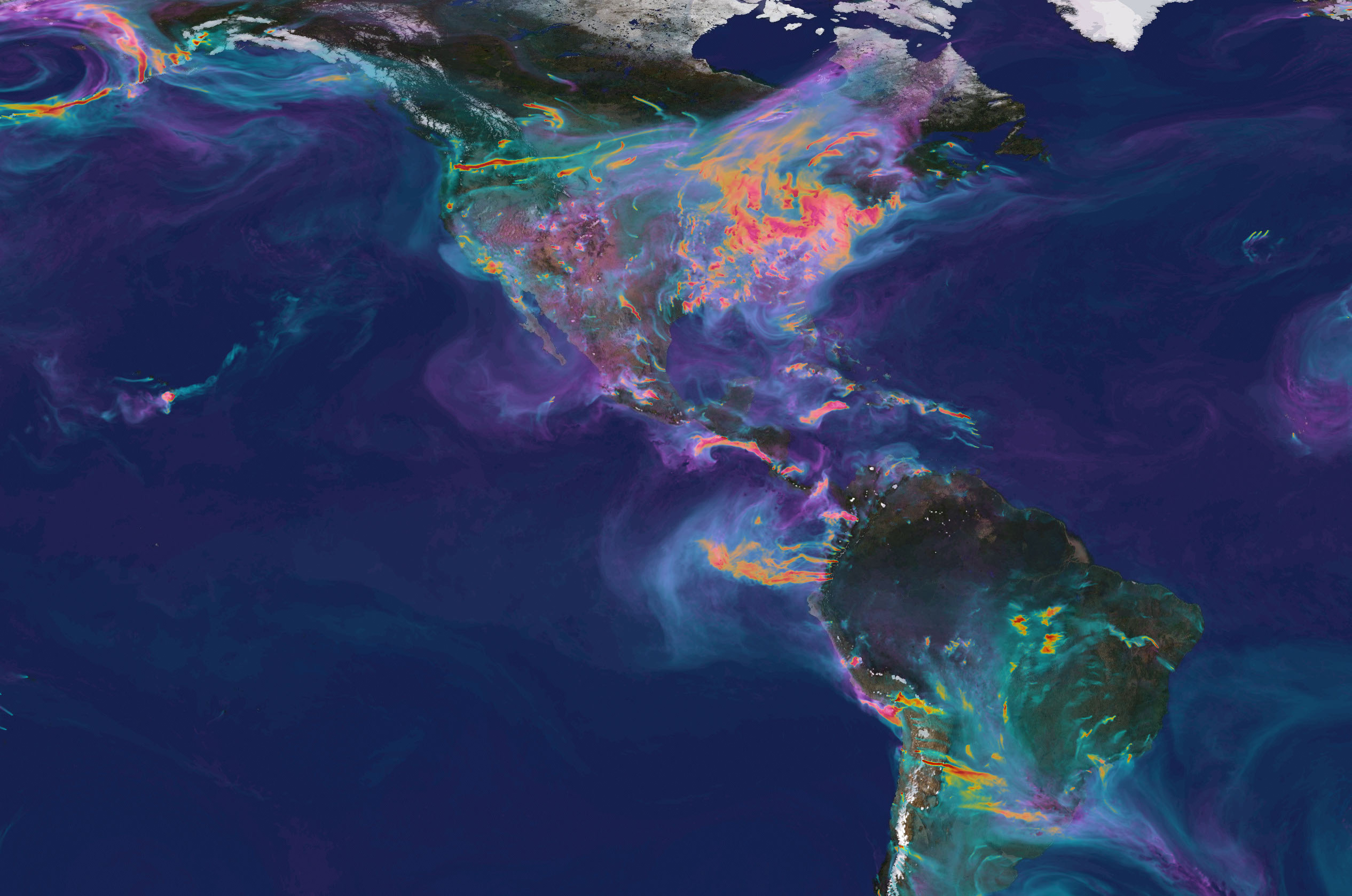 In the data model visualization below, green represents organic carbon, black carbon, and sulfate aerosols. Organic and black carbon come from burning biomass or fossil fuels. Sources include fires, power plants, vehicles, and other combustion engines that run on fossil fuel. Sulfate particles come mostly from burning fossil fuels, but also from volcanoes.