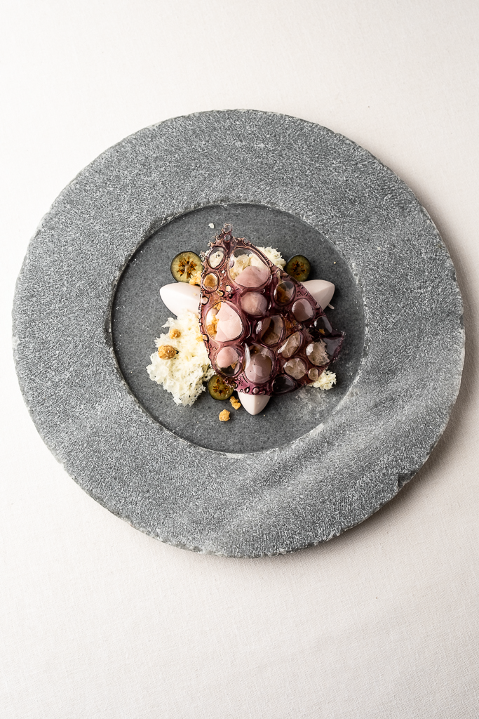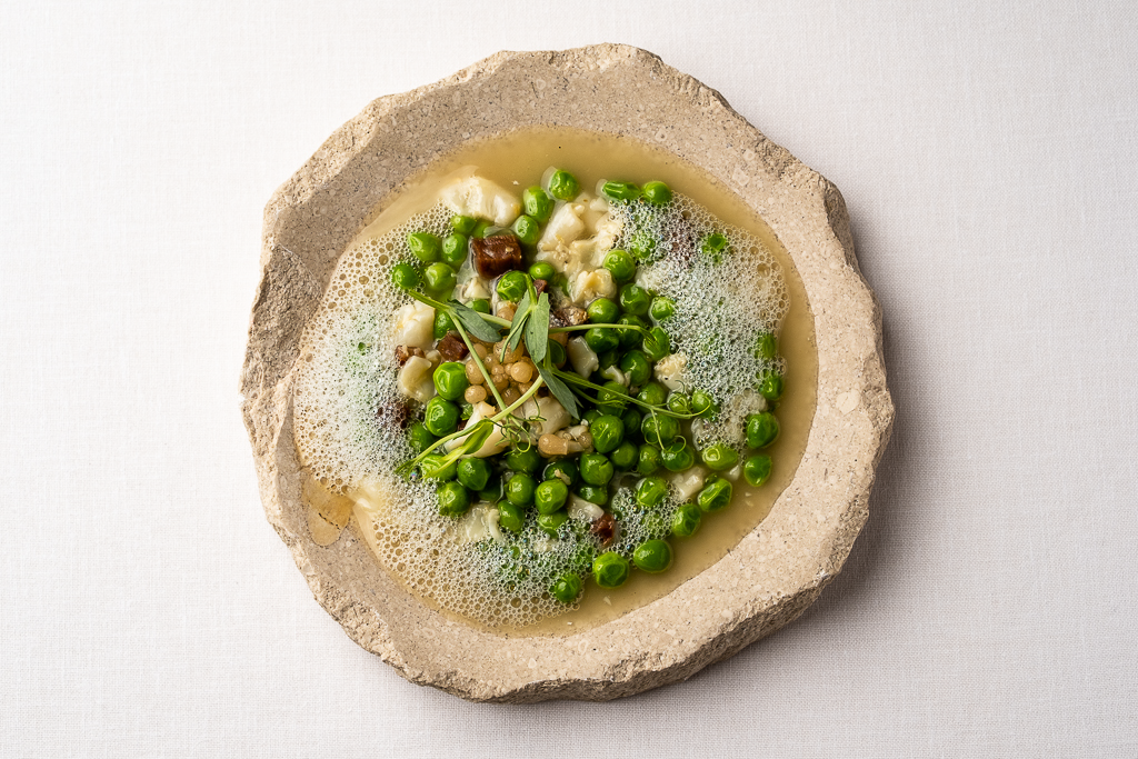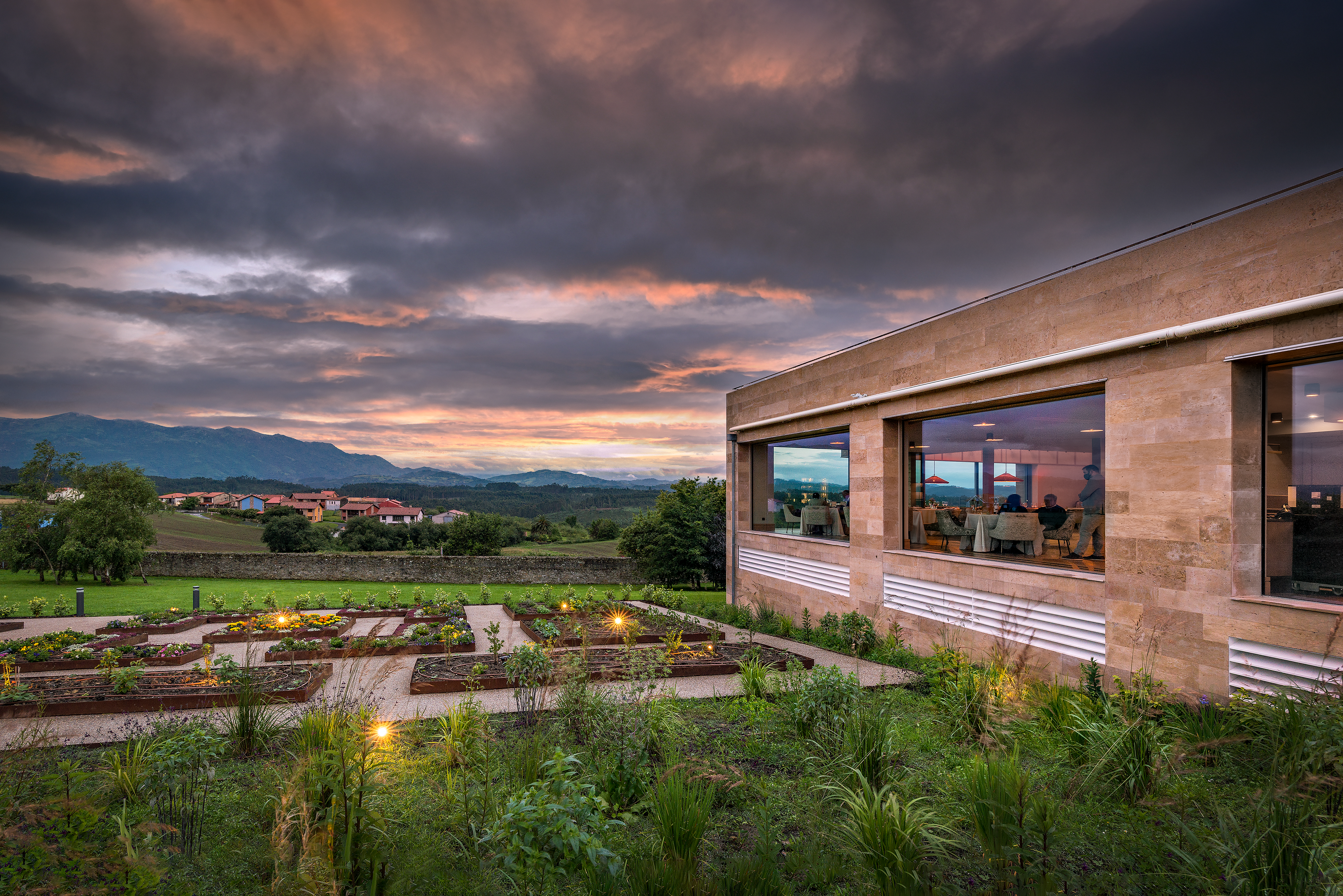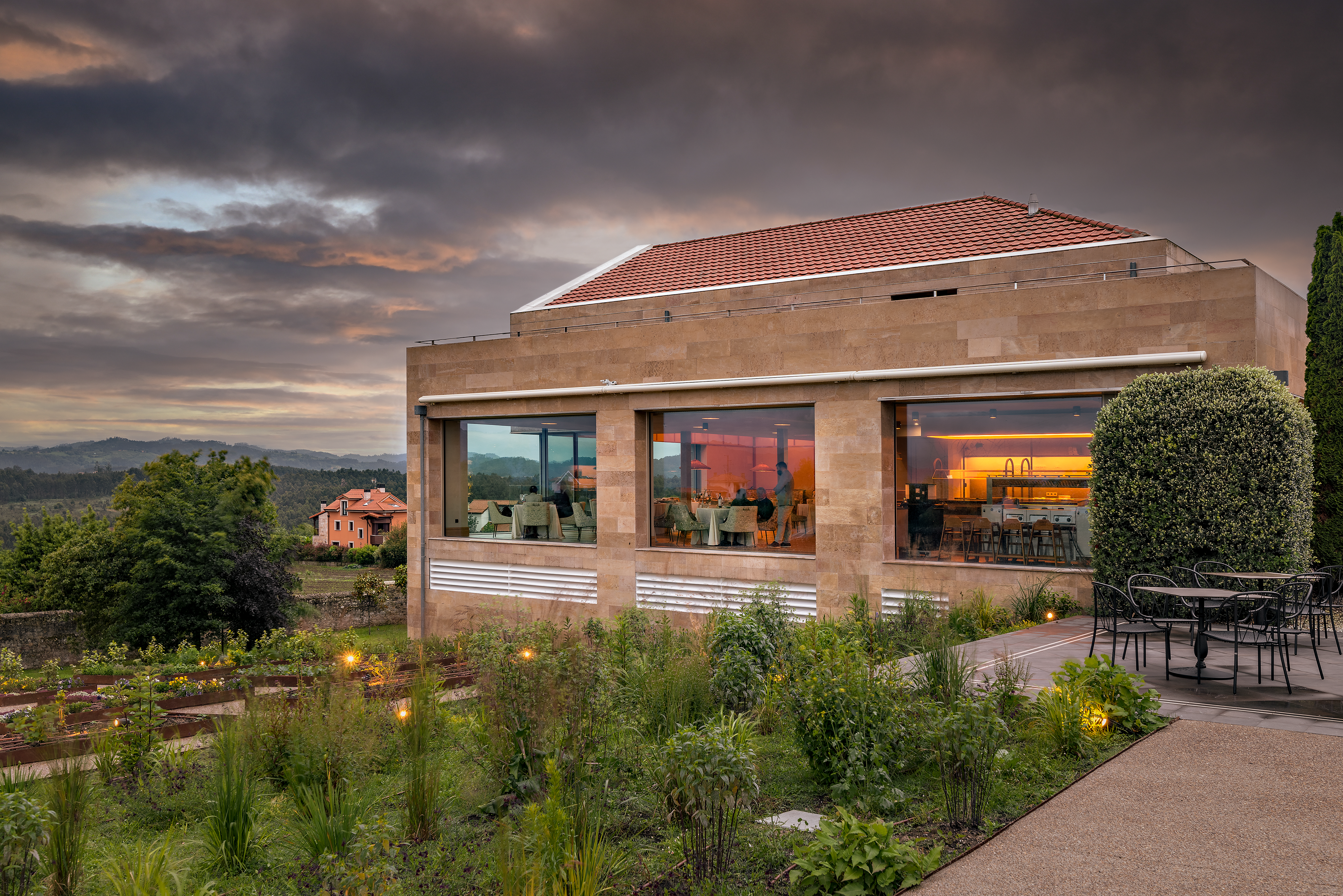 Nature and style. The restaurant's large window offers us an incomparable view of the marvellous landscape of Asturias which supplies Ignacio García Canellada's kitchens with irresistible dishes such as his salad of scallops confit in citrus fruits, bed of wakame seaweed and green apple emulsion with marine touches; tips of white asparagus from the garden, toasted ajoblanco (cold almond soup) and marinated red tuna; P.G.I. Asturias beef with lobster from the Bay of Biscay; creamy rice with grilled scarlet shrimp finished in a wood-fire oven; John Dory with saffron mussel velouté and pickled vegetables; Pitu de caleya (free-range chicken dish) mole with grilled avocado cream and avocado peel popcorn; or a caramelised torrija (a type of French toast), cinnamon foam and toffee ice cream.