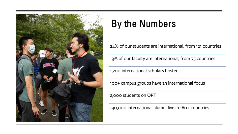 "Cornell has always been at home in the world. We had international students in our first graduating class, and our faculty and students began working with international partners on collaborative projects abroad over a century ago. Today, Cornell students and faculty advise the United Nations, co-author IPCC reports, are involved in international law, human rights, AIDS prevention in Haiti, new wheat varieties, and help to design cities of the future from Singapore to Sao Paulo. Our students are educated as global citizens, and they need this more now than ever in order to lead this world they are inheriting."