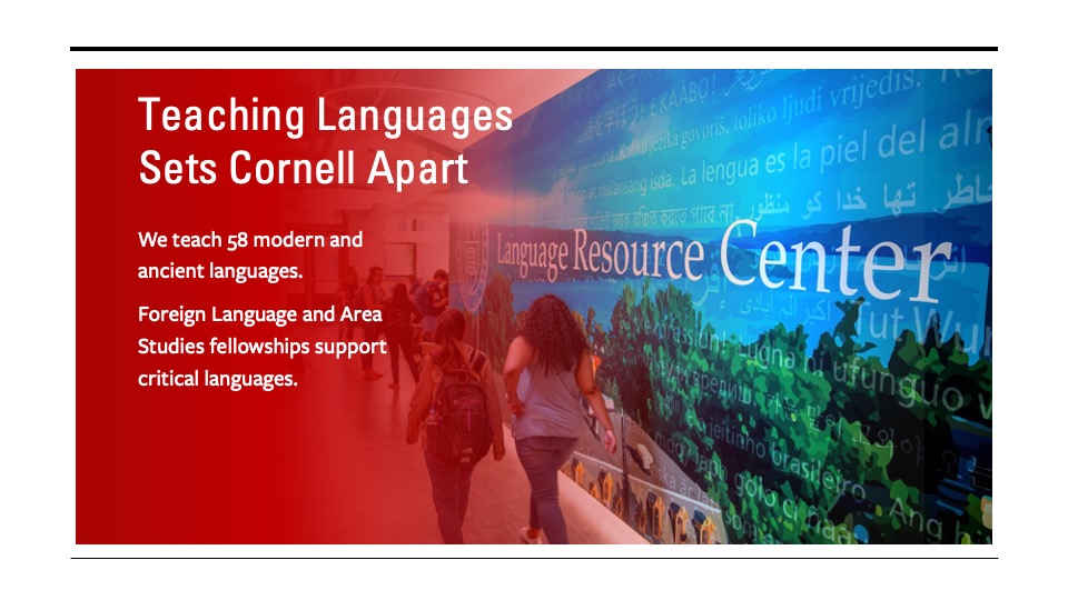"International activity often requires other languages, and this is an area where Cornell excels. We teach 58 languages, rare and distinguished ones like Sinhalese and Khmer. Students can get immersive language training, or they can participate in our Jump Start program and get targeted, intensive instruction."