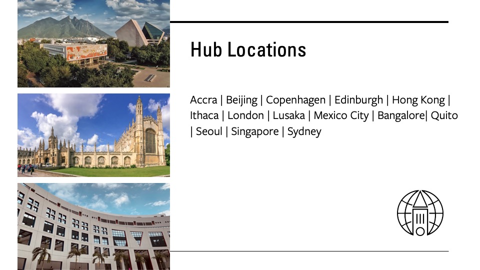 "To support and build on this research and education, we are introducing Global Hubs in 14 cities around the world. Hubs are not physical infrastructure; they are relationships, university-level relationships with peer universities based on the principle of mutual exchange."