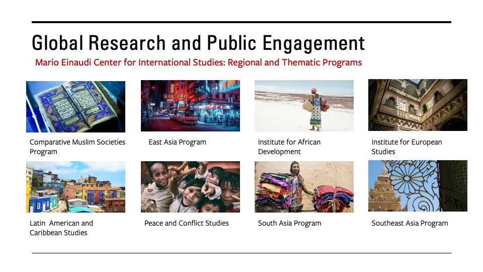 "Students who want to work abroad come together with faculty at the Mario Einaudi Center for International Studies, our hub for international and area studies research on campus. It is a second home for people who are interested in international issues, with seminars, minors, fellowships, and expertise. Einaudi responds to world events; recently, faculty put together a panel on Ukraine, with five experts from across campus, including one Russian dissident, for 2,300 people."