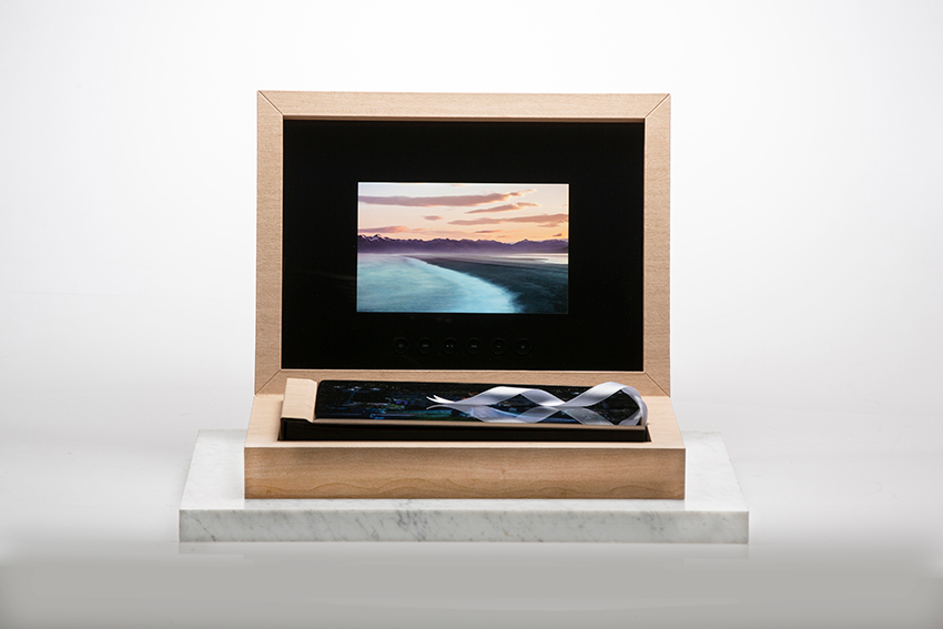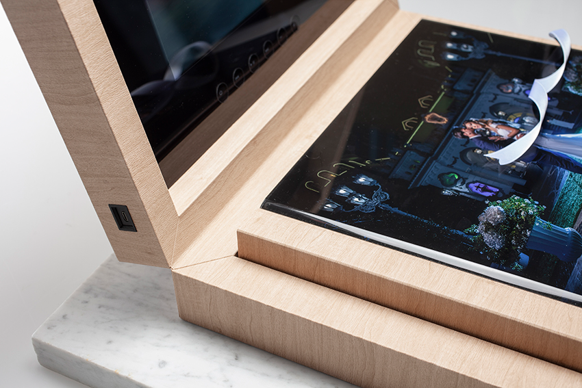 This album comes with a specialised box with an HD screen built in allowing you to store and view all your wedding films or slideshow of images. Ideal as a present for grandparents or those who aren't tech savvy with online galleries and videos and would like to hold everything in their hands.