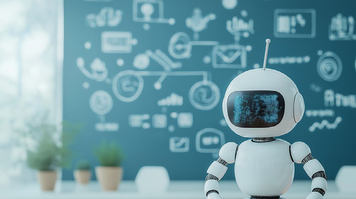 Created with images by Kingdola - "AI robot teaching a class in futuristic" • Melvin - "Cute friendly artificial intelligence robot using laptop computer with white neon glow light, light grey background, chatbot and AI assistant concept futuristic technology 3d illustration, banner"